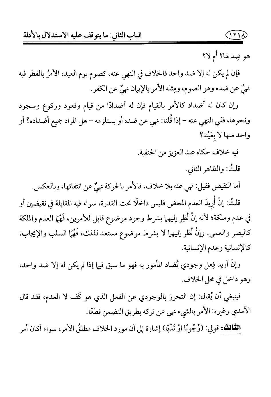فإن لم يكن له إلا ضد واحد فالخلاف في النهي عنه، كصوم يوم العيد، الأمرُ بالفطر فيه نهى عن ضده وهو الصوم، ومِثله الأمر بالإيمان نهيٌ عن الكفر.