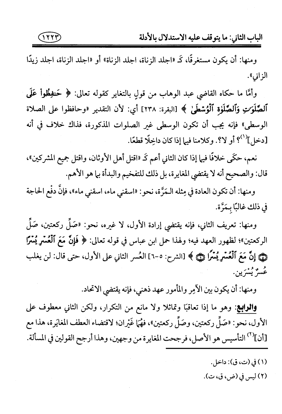 وأمَّا ما حكاه القاضي عبد الوهاب من قولي بالتغاير كقوله تعالى: {حَافِظُوا عَلَى الصَّلَوَاتِ وَالصَّلَاةِ الْوُسْطَى} [البقرة: ٢٣٨] أي: لأن التقدير "وحافظوا على الصلاة الوسطى" فإنه يجب أن تكون الوسطى غير الصلوات المذكورة، فذاك خلاف في أنه [دخل] (¬١)؟ أو لا؟ . وكلامنا فيما إذا كان داخِلًا قطعًا.