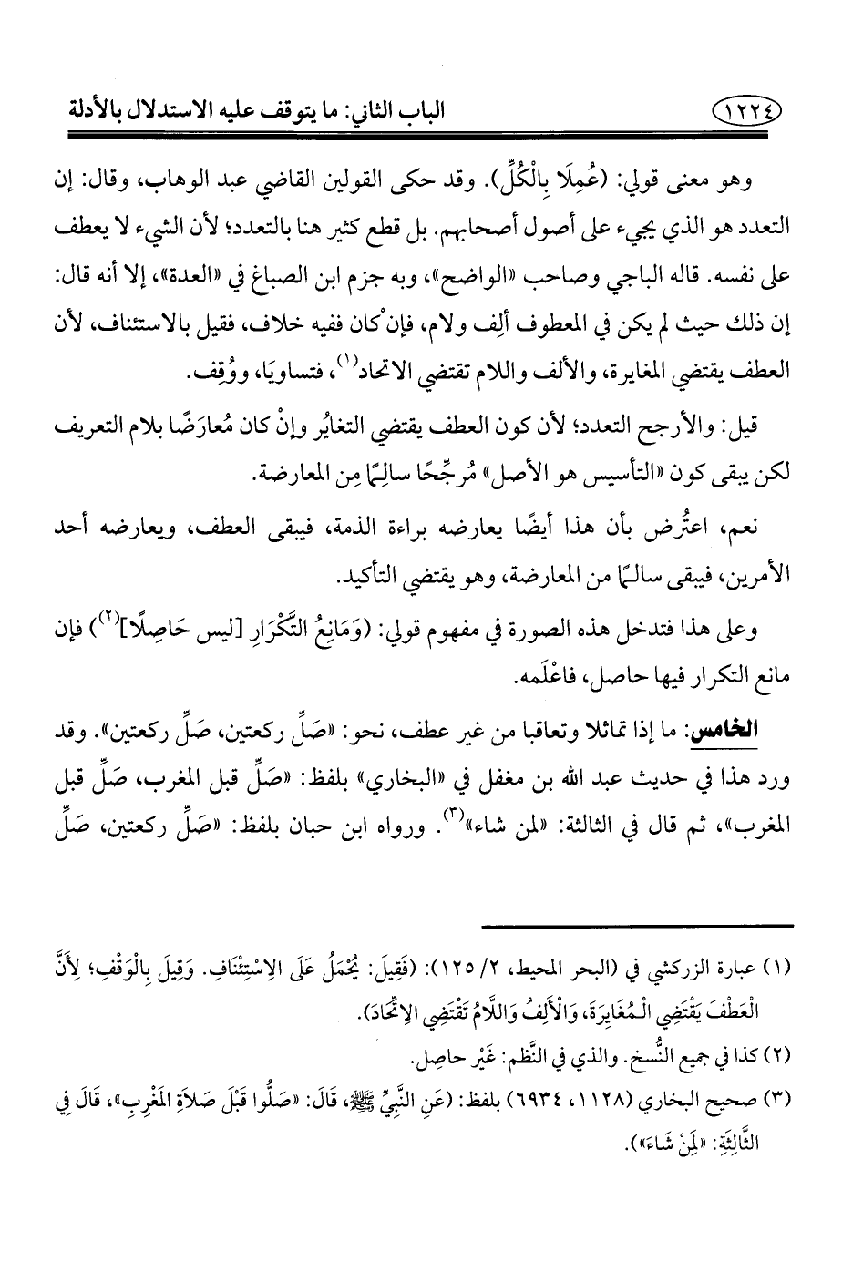 قيل: والأرجح التعدد؛ لأن كون العطف يقتضي التغايُر وإنْ كان مُعارَضًا بلام التعريف لكن يبقى كون "التأسيس هو الأصل" مُرجِّحًا سالِمًا مِن المعارضة.