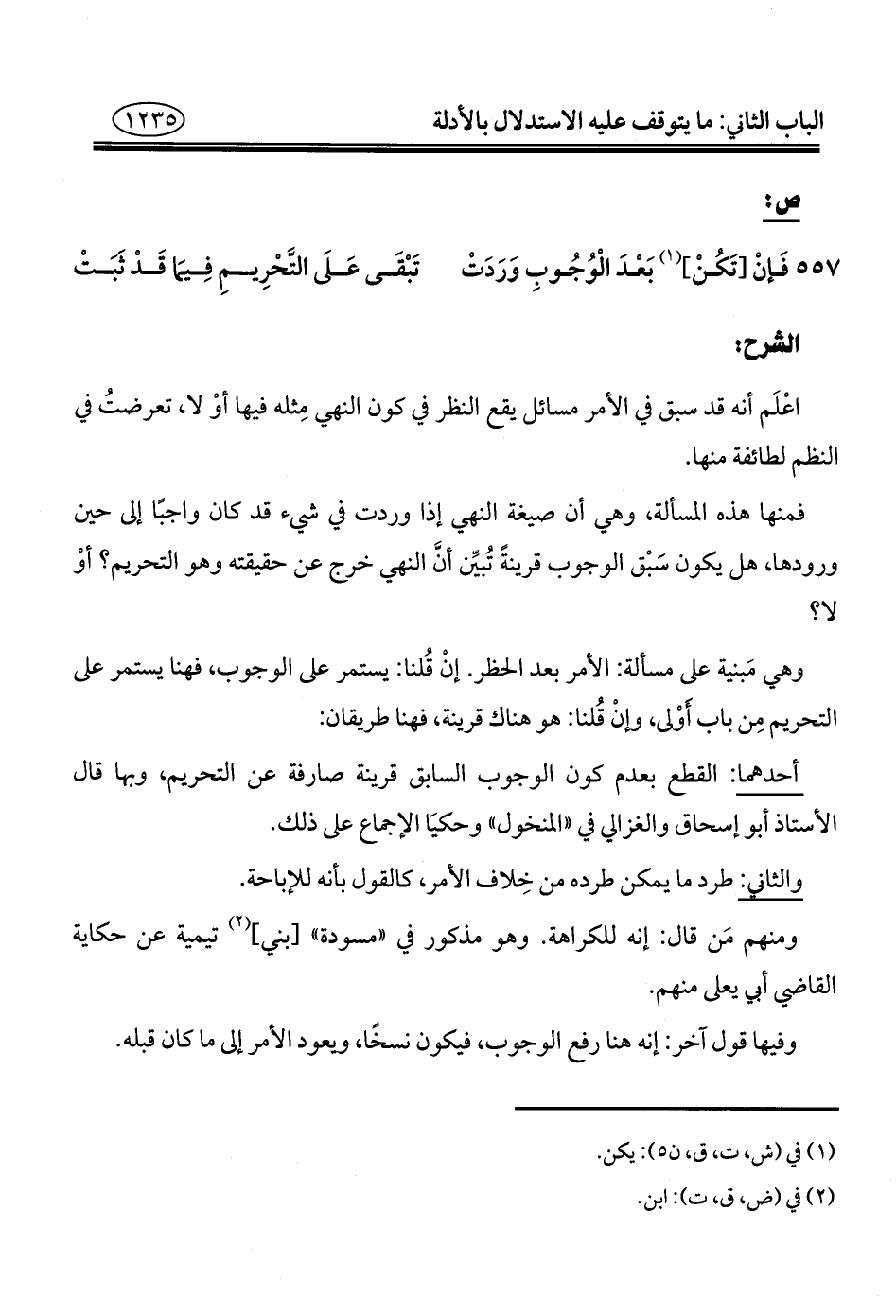 وهي مَبنية على مسألة: الأمر بعد الحظر. إنْ قُلنا: يستمر على الوجوب، فهنا يستمر على التحريم مِن باب أَوْلى، وإنْ قُلنا: هو هناك قرينة، فهنا طريقان: