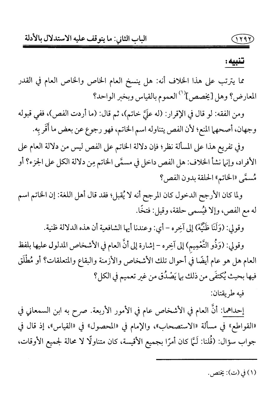 وفي تفريع هذا على المسألة نظر؛ فإن دلالة الخاتم على الفص ليس من دلالة العام على الأفراد، وإنما نشأ الخلاف: هل الفص داخل في مسمَّى الخاتم مِن دلالة الكل على الجزء؟ أو مُسمَّى "الخاتم" الحلقة بدون الفص؟