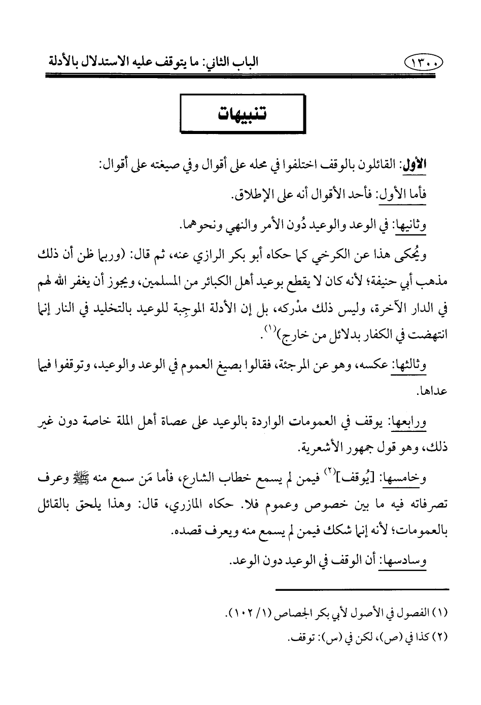 وخامسها: [يُوقف] (¬٢) فيمن لم يسمع خطاب الشارع، فأما مَن سمع منه - صلى الله عليه وسلم - وعرف تصرفاته فيه ما بين خصوص وعموم فلا. حكاه المازري، قال: وهذا يلحق بالقائل بالعمومات؛ لأنه إنما شكك فيمن لم يسمع منه ويعرف قصده.