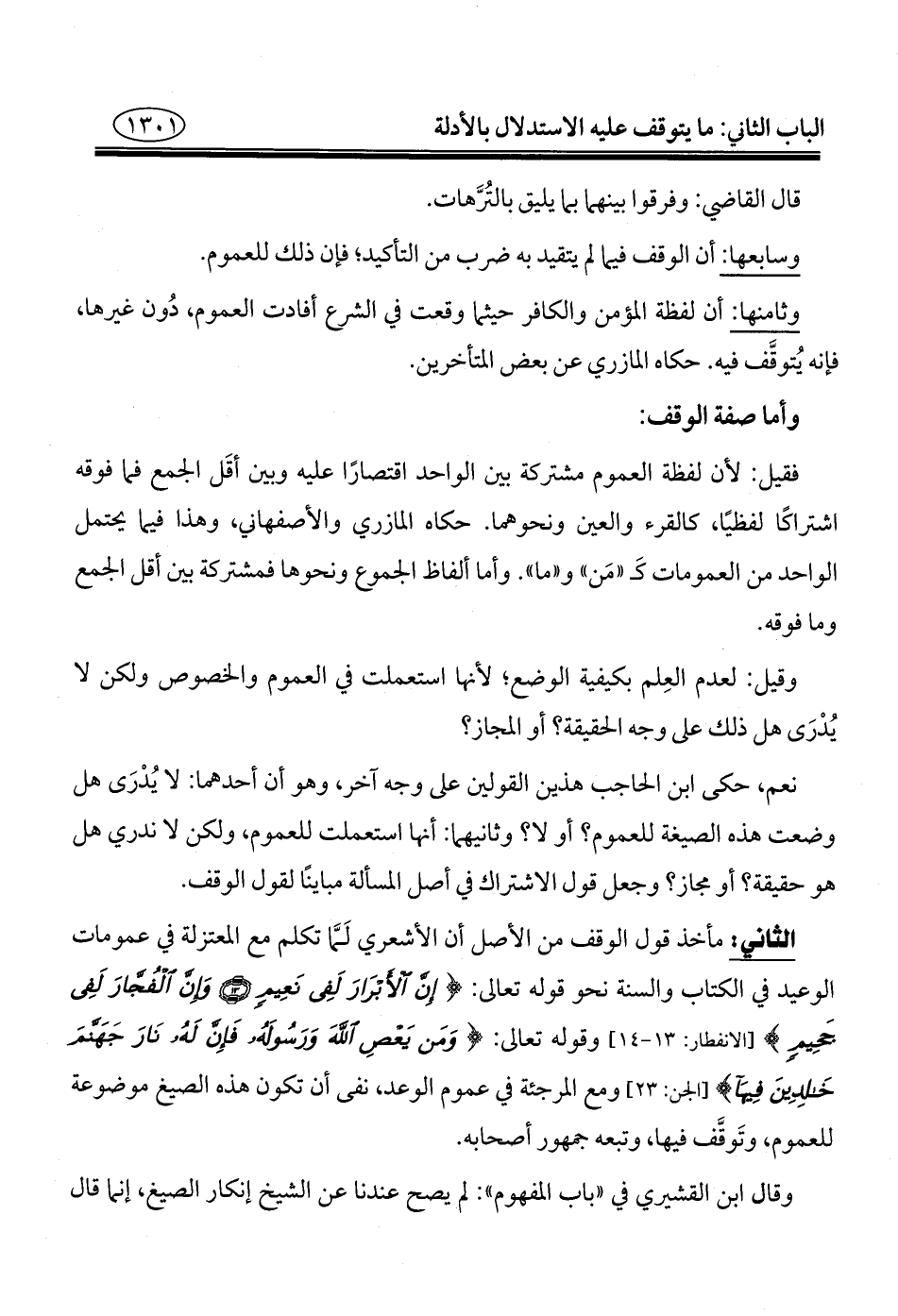 الثاني: مأخذ قول الوقف من الأصل أن الأشعري لمَّا تكلم مع المعتزلة في عمومات الوعيد في الكتاب والسنة نحو قوله تعالى: {إِنَّ الْأَبْرَارَ لَفِي نَعِيمٍ (١٣) وَإِنَّ الْفُجَّارَ لَفِي جَحِيمٍ} [الانفطار: ١٣ - ١٤]، وقوله تعالى: {وَمَنْ يَعْصِ اللَّهَ وَرَسُولَهُ فَإِنَّ لَهُ نَارَ جَهَنَّمَ خَالِدِينَ فِيهَا} [الجن: ٢٣] ومع المرجئة في عموم الوعد، نفى أن تكون هذه الصيغ موضوعة للعموم، وتَوقَّف فيها، وتبعه جمهور أصحابه.
