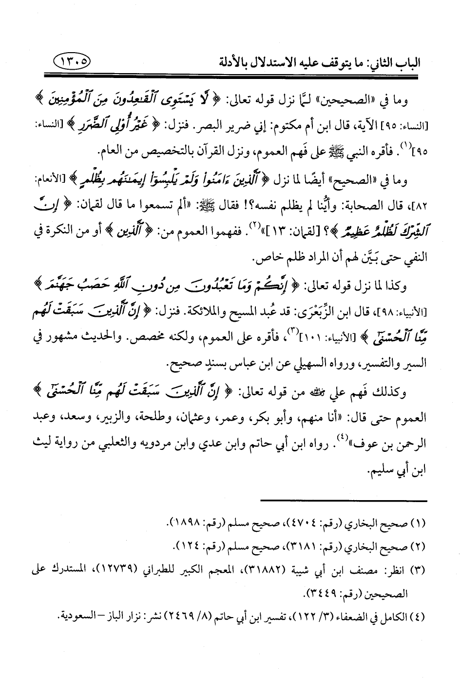 وكذلك فَهم علي - رضي الله عنه - من قوله تعالى: {إِنَّ الَّذِينَ سَبَقَتْ لَهُمْ مِنَّا الْحُسْنَى} العموم حتى قال: "أنا منهم، وأبو بكر، وعمر، وعثمان، وطلحة، والزبير، وسعد، وعبد الرحمن بن عوف" (¬٤). رواه ابن أبي حاتم وابن عدي وابن مردويه والثعلبي من رواية ليث ابن أبي سليم.