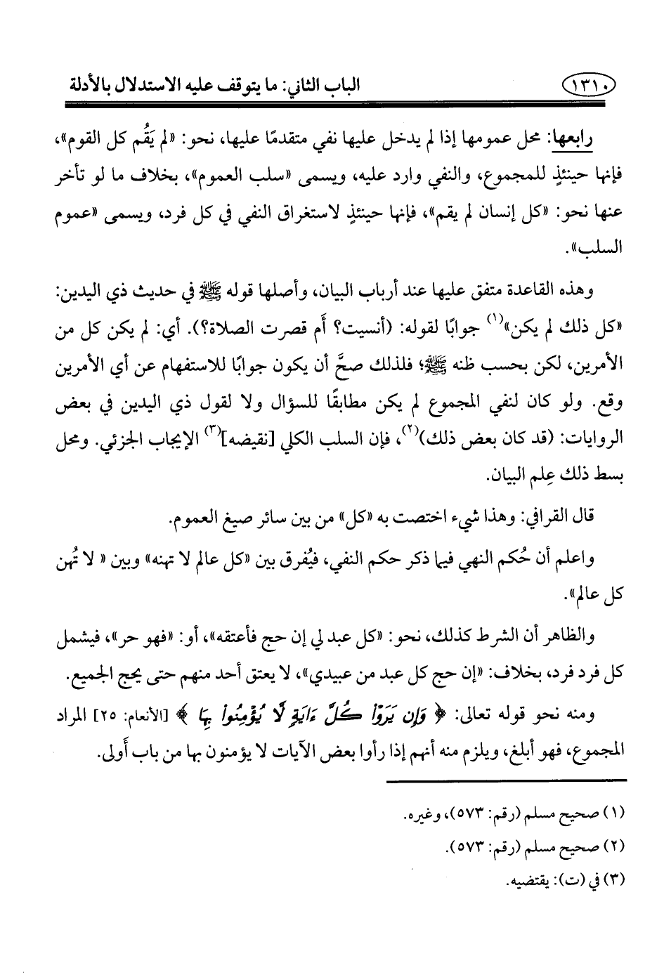 وهذه القاعدة متفق عليها عند أرباب البيان، وأصلها قوله -صلى الله عليه وسلم-في حديث ذي اليدين: "كل ذلك لم يكن" (¬١) جوابًا لقوله: (أنسيمت؟ أَم قصرت الصلاة؟ ). أي: لم يكن كل من الأمرين، لكن بحسب ظنه -صلى الله عليه وسلم-؛ فلذلك صحَّ أن يكون جوابًا للاستفهام عن أي الأمرين وقع. ولو كان لنفي المجموع لم يكن مطابقًا للسؤال ولا لقول ذي اليدين في بعض الروايات: (قد كان بعض ذلك) (¬٢)، فإن السلب الكلي [نقيضه] (¬٣) الإيجاب الجزئي. ومحل بسط ذلك عِلم البيان.