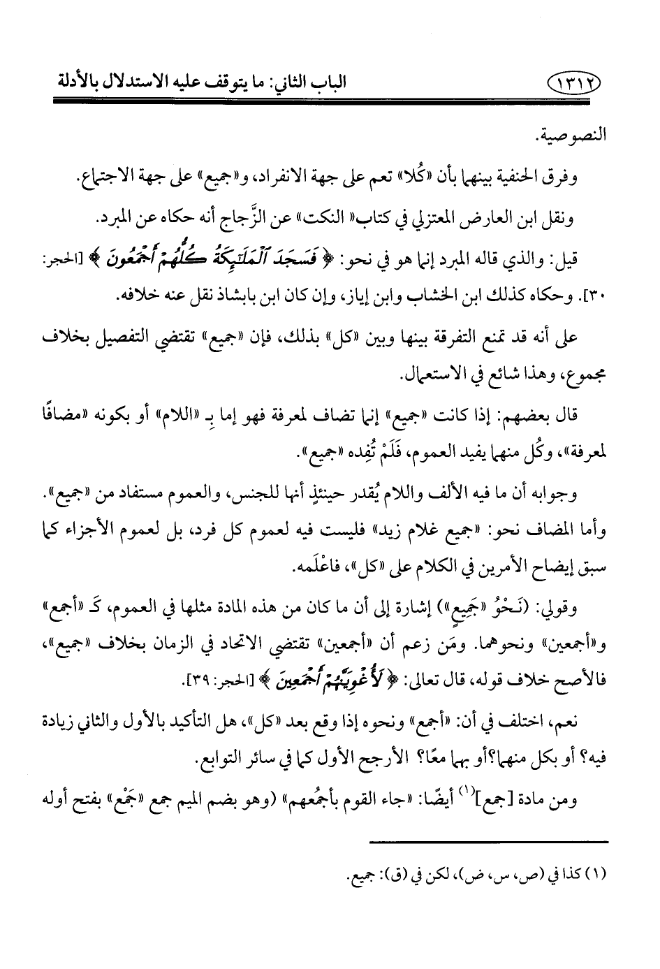 وقولي: (نَحْوُ "جَمِيعٍ") إشارة إلى أن ما كان من هذه المادة مثلها في العموم، كَـ"أجمع" و"أجمعين" ونحوهما. ومَن زعم أن "أجمعين" تقتضي الاتحاد في الزمان بخلاف "جميع"، فالأصح خلاف قوله، قال تعالى: {وَلَأُغْوِيَنَّهُمْ أَجْمَعِينَ} [الحجر: ٣٩].