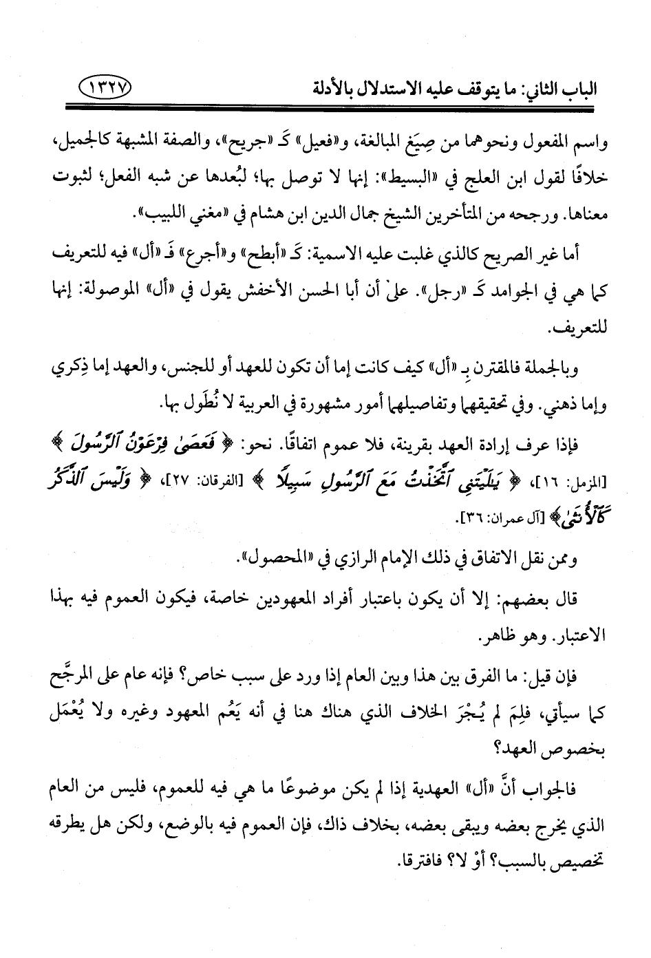 فإذا عرف إرادة العهد بقرينة، فلا عموم اتفاقًا. نحو: {فَعَصَى فِرْعَوْنُ الرَّسُولَ} [المزمل: ١٦]، {يَالَيْتَنِي اتَّخَذْتُ مَعَ الرَّسُولِ سَبِيلًا} [الفرقان: ٢٧]، {وَلَيْسَ الذَّكَرُ كَالْأُنْثَى} [آل عمران: ٣٦].