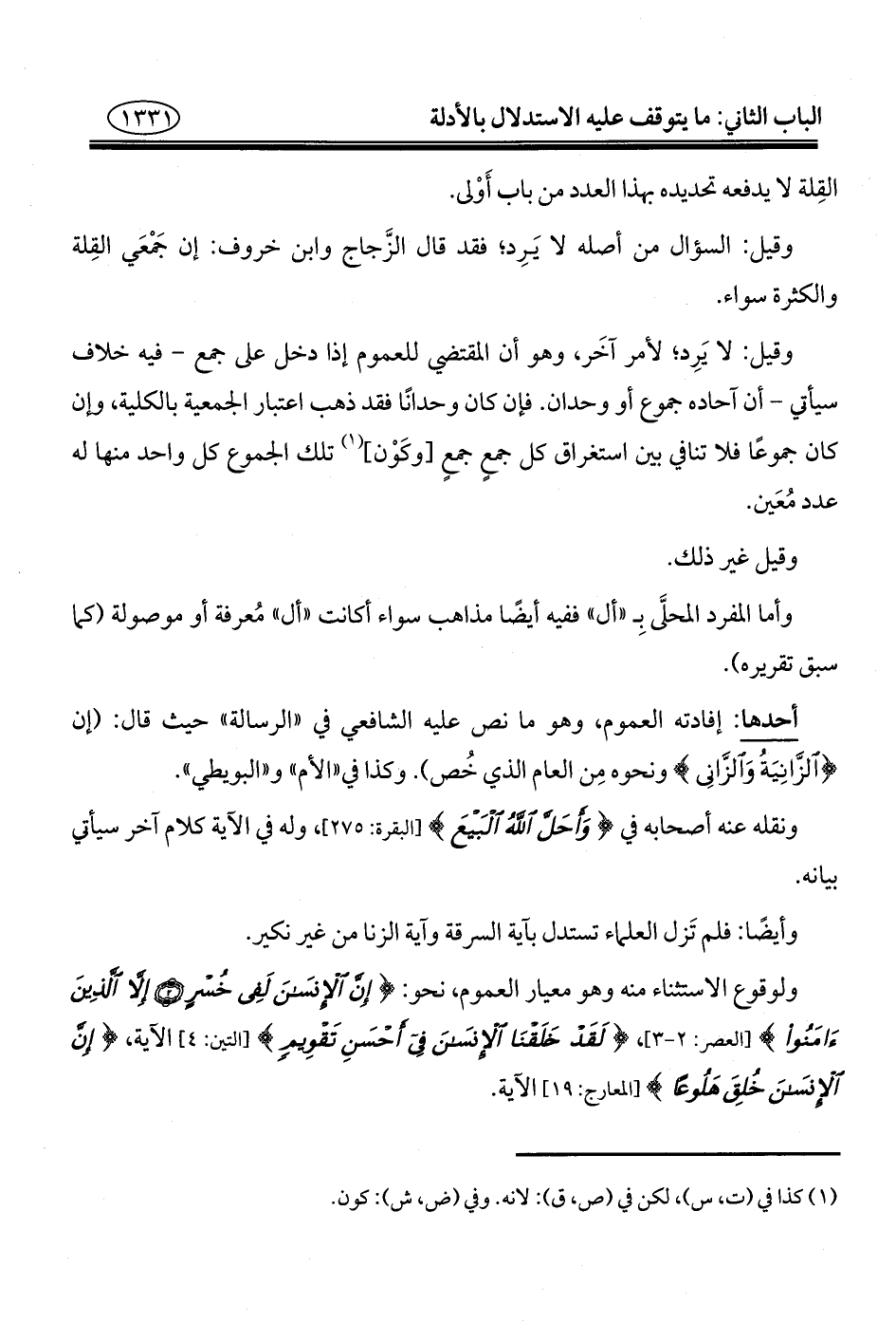 ولوقوع الاستثناء منه وهو معيار العموم، نحو: {إِنَّ الْإِنْسَانَ لَفِي خُسْرٍ (٢) إِلَّا الَّذِينَ آمَنُوا} [العصر: ٢ - ٣]، {لَقَدْ خَلَقْنَا الْإِنْسَانَ فِي أَحْسَنِ تَقْوِيمٍ} [التين: ٤] الآية، {إِنَّ الْإِنْسَانَ خُلِقَ هَلُوعًا} [المعارج: ١٩] الآية.
