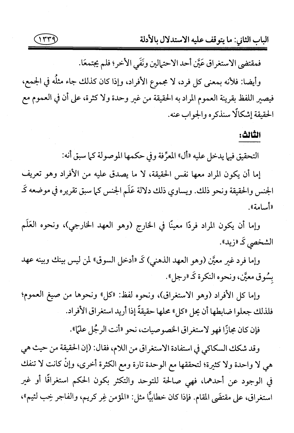 وإما كل الأفراد (وهو الاستغراق)، ونحوه لفظ: "كل" ونحوها من صيغ العموم؛ فلذلك جعلوا ضابطها أن يحل "كل" محلها حقيقةً إذا أريد استغراق الأفراد.