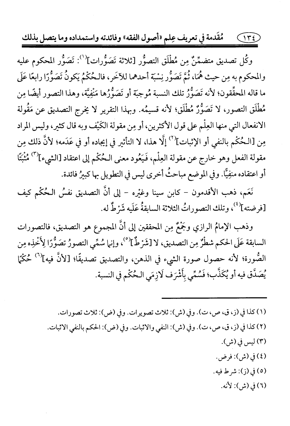 وكُل تصديق متضمِّنٌ مِن مُطْلَق التصوُّر [ثلاثة تَصَوُّرات] (¬١): تَصَوُّر المحكوم عليه والمحكوم به مِن حيث هُمَا، ثُمَّ تَصَوُّر نِسْبة أحدهما للآخَر، فالحُكْمُ يَكونُ تَصَوُّرًا رابعًا عَلَى ما قاله المحقِّقون؛ لأنه تَصَوُّرُ تلك النسبة مُوجبَة أو تَصَوُّرُها مَنْفِيَّة، وهذا التصور أيضًا مِن مُطْلَق التصور، لا تَصَوُّرٌ مُطْلَق؛ لأنه قسيمُه. وبهذا التقرير لا يخرج التصديق عن مَقُولة الانفعال التي منها العِلْم على قول الأكثرين، أو مِن مقولة الكَيْف وبه قال كثير، وليس المراد مِن [الحُكْم بالنفي أو الإثبات] (¬٢) إلَّا هذا، لا التأثير في إيجاده أو في عَدَمه؛ لأنَّ ذلك مِن مقولة الفعل وهو خارج عن مقولة العِلْم، فَيَعُود معنى الحُكْم إلى اعتقاد [الشيء] (¬٣) مُثْبَتًا أو اعتقاده منفِيًّا. وفي الموضع مباحثُ أخرى ليس في التطويل بها كبيرُ فائدة.