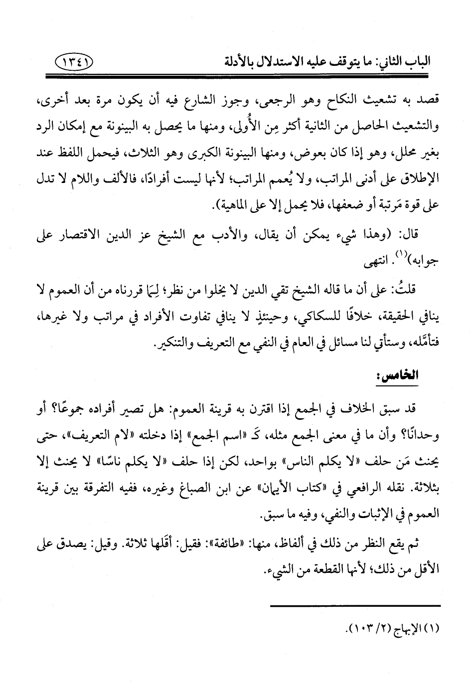 قلتُ: على أن ما قاله الشيخ تقي الدين لا يخلوا من نظر؛ لِمَا قررناه من أن العموم لا ينافي الحقيقة، خلافًا للسكاكي، وحينئذٍ لا ينافي تفاوت الأفراد في مراتب ولا غيرها، فتأمَّله، وستأتي لنا مسائل في العام في النفي مع التعريف والتنكير.
