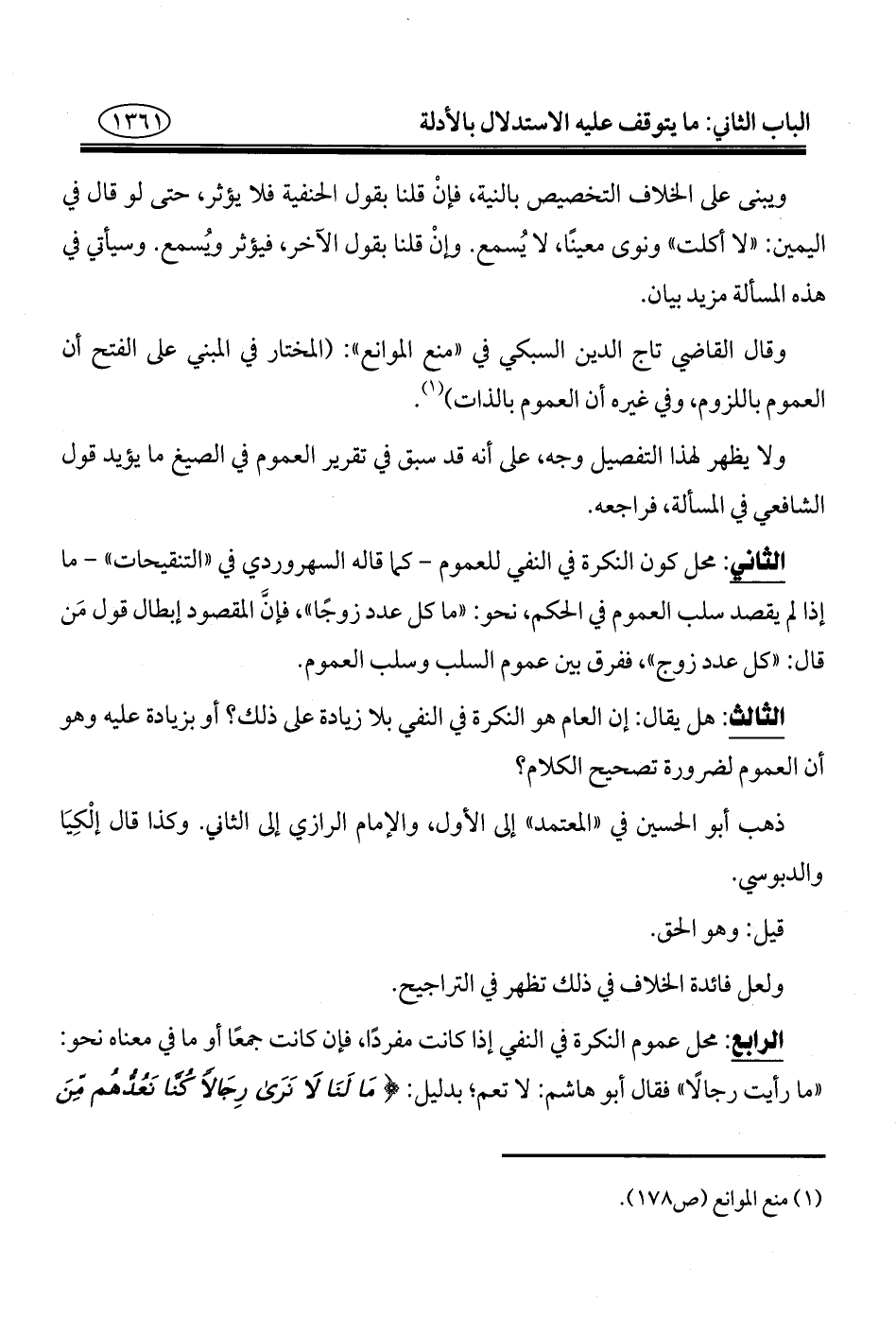 الرابع: محل عموم النكرة في النفي إذا كانت مفردًا، فإن كانت جمعًا أو ما في معناه نحو: "ما رأيت رجالًا" فقال أبو هاشم: لا تعم؛ بدليل: {مَا لَنَا لَا نَرَى رِجَالًا كُنَّا نَعُدُّهُمْ مِنَ