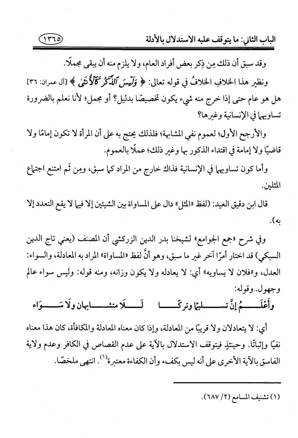 وفي شرح "جمع الجوامع" لشيخنا بدر الدين الزركشي أن المصنف (يعني تاج الدين السبكي) قد اختار أمرًا آخر غير ما سبق، وهو أنَّ لفظ "المساواة" المراد به المعادلة، والسواء: العدل، و"فلان لا يساويه" أي: لا يعادله ولا يكون وزانه، ومنه قوله: وليس سواء عالم وجهول. وقوله: