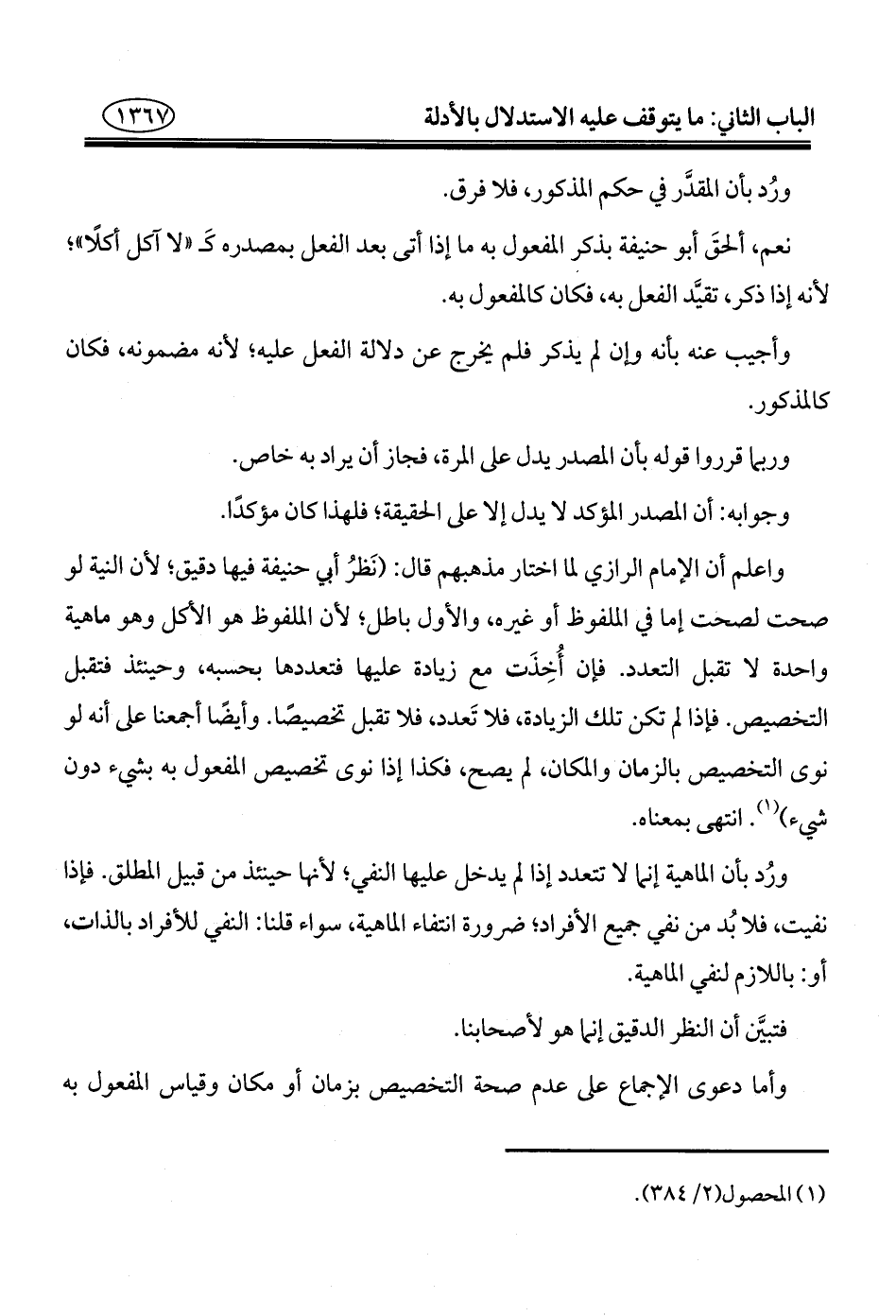 واعلم أن الإِمام الرازي لما اختار مذهبهم قال: (نَظرُ أبي حنيفة فيها دقيق؛ لأن النية لو صحت لصحت إما في الملفوظ أو غيره، والأول باطل؛ لأن الملفوظ هو الأكل وهو ماهية واحدة لا تقبل التعدد. فإن أُخِذَت مع زيادة عليها فتعددها بحسبه، وحينئذ فتقبل التخصيص. فإذا لم تكن تلك الزيادة، فلا تَعدد، فلا تقبل تخصيصًا. وأيضًا أجمعنا على أنه لو نوى التخصيص بالزمان والمكان، لم يصح، فكذا إذا نوى تخصيص المفعول به بشيء دون شيء) (¬١). انتهى بمعناه.