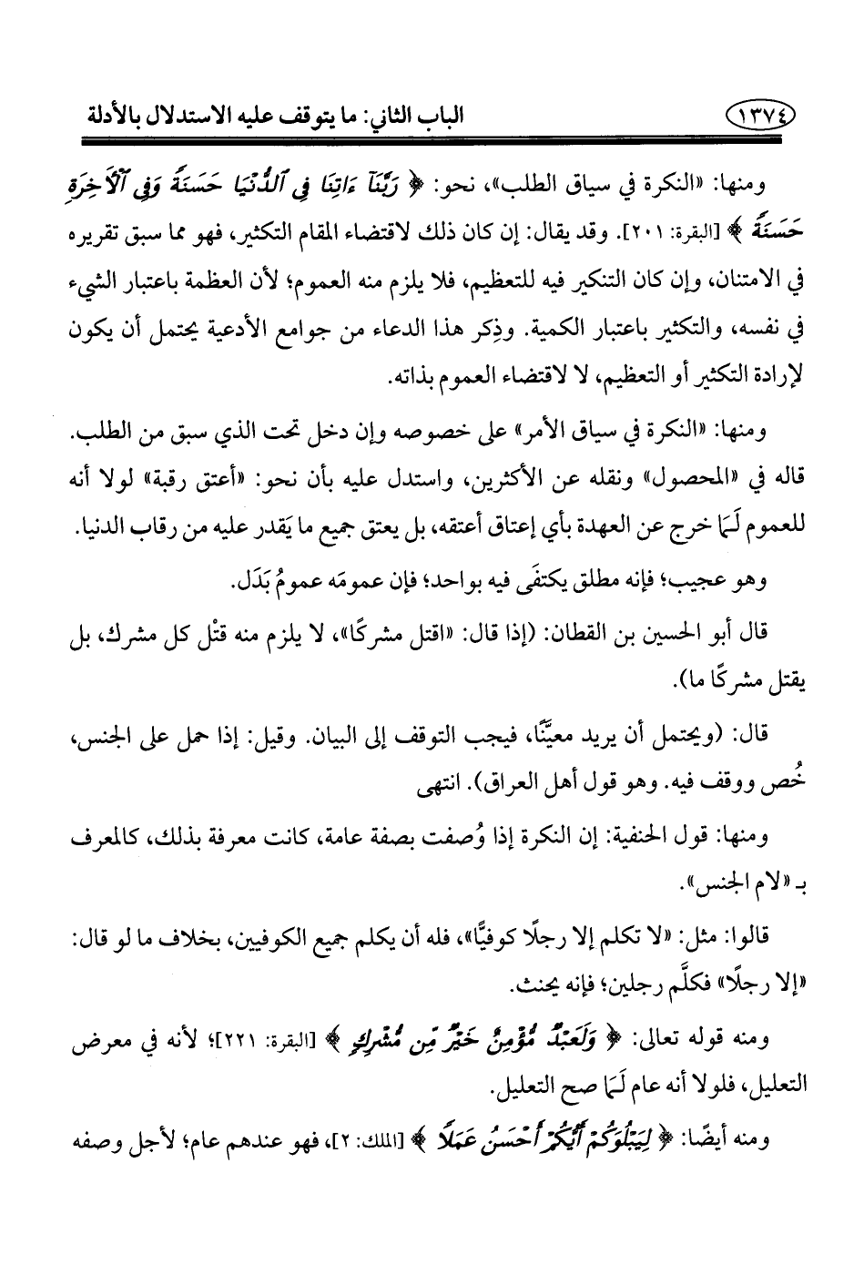 ومنها: "النكرة في سياق الطلب"، نحو: {رَبَّنَا آتِنَا فِي الدُّنْيَا حَسَنَةً وَفِي الْآخِرَةِ حَسَنَةً} [البقرة: ٢٠١]. وقد يقال: إن كان ذلك لاقتضاء المقام التكثير، فهو مما سبق تقريره في الامتنان، وإن كان التنكير فيه للتعظيم، فلا يلزم منه العموم؛ لأن العظمة باعتبار الشيء في نفسه، والتكثير باعتبار الكمية. وذِكر هذا الدعاء من جوامع الأدعية يحتمل أن يكون لإرادة التكثير أو التعظيم، لا لاقتضاء العموم بذاته.