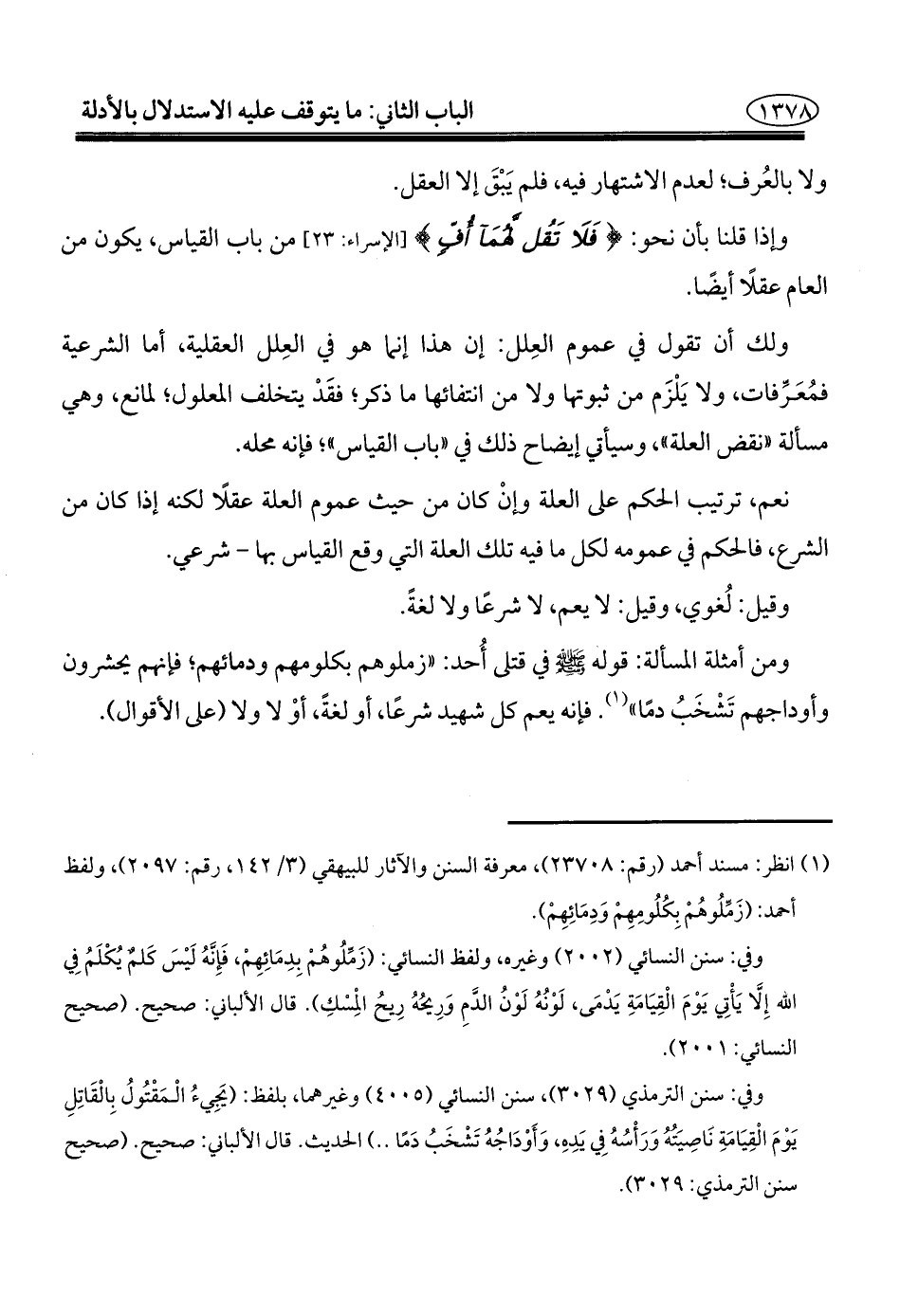 ومن أمثلة المسألة: قولة - صلى الله عليه وسلم - في قتلى أُحد: "زملوهم بكلومهم ودمائهم؛ فانهم يحشرون وأوداجهم تَشْخَبُ دمًا" (¬١). فإنه يعم كل شهيد شرعًا، أو لغةً، أوْ لا ولا (على الأقوال).