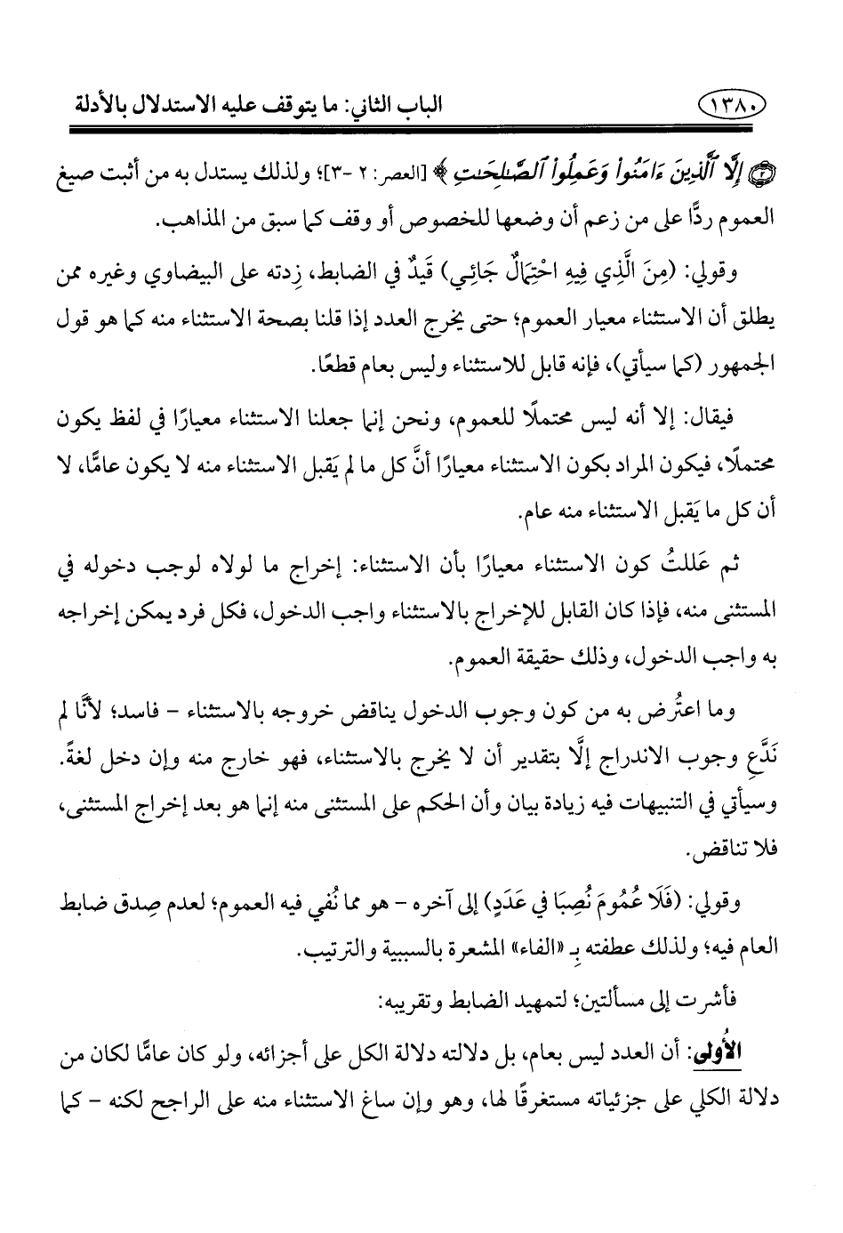 إِلَّا الَّذِينَ آمَنُوا وَعَمِلُوا الصَّالِحَاتِ} [العصر: ٢، ٣]؛ ولذلك يستدل به من أثبت صيغ العموم ردًّا على من زعم أن وضعها للخصوص أو وقف كما سبق من المذاهب.