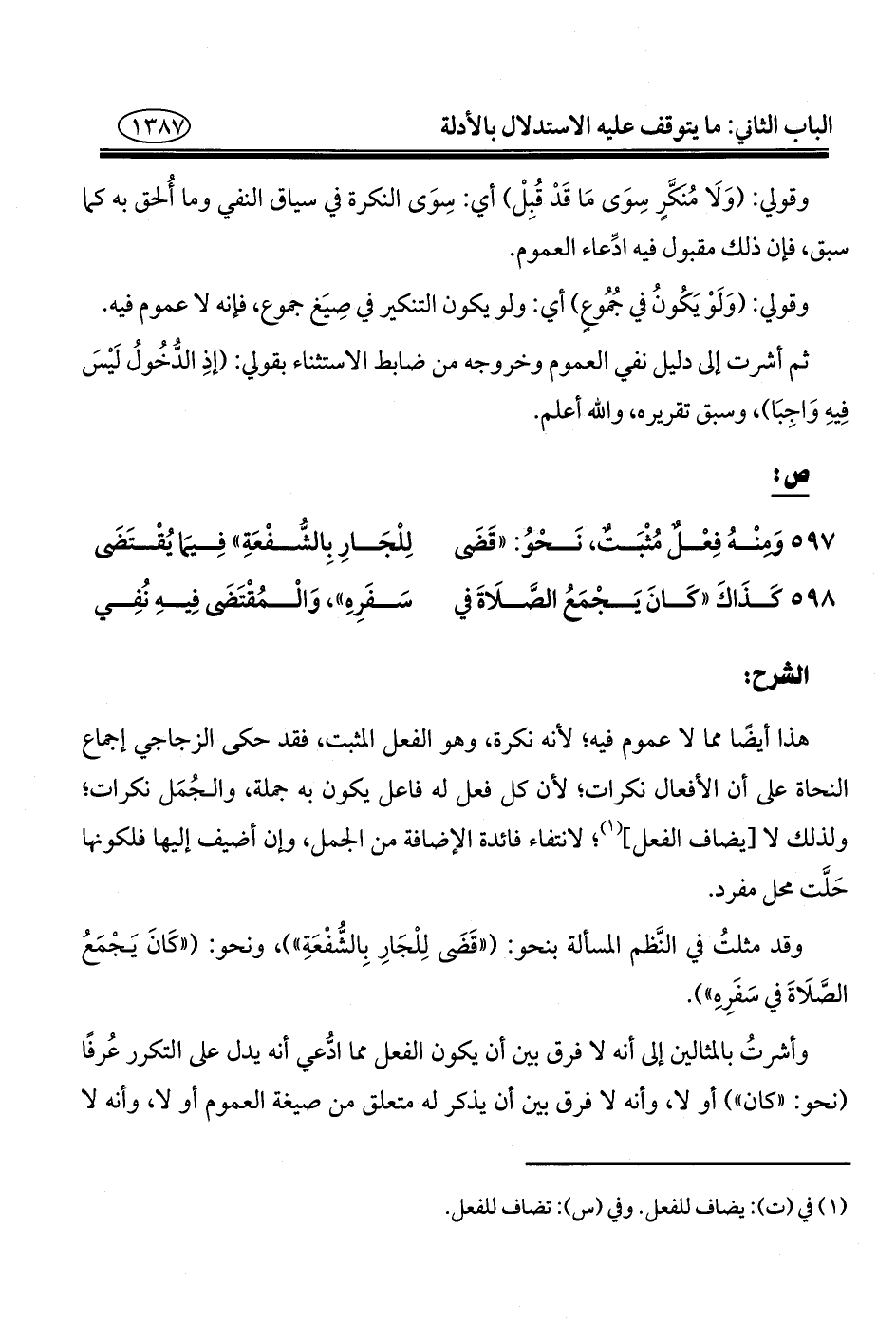 وقد مثلتُ في النَّظم المسألة بنحو: ("قَضَى لِلْجَارِ بِالشُّفْعَةِ")، ونحو: ("كَانَ يَجْمَعُ الصَّلَاةَ في سَفَرِهِ").