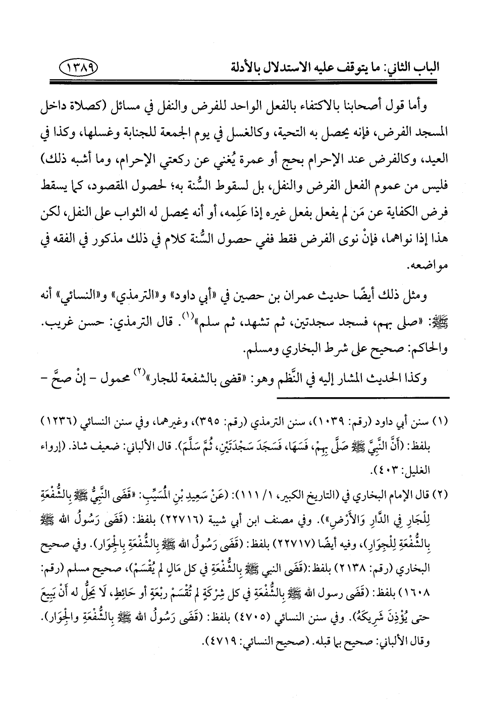(¬٢) قال الإِمام البخاري في (التاريخ الكبير، ١/ ١١١): (عَنْ سَعِيدِ بْنِ المُسَيِّبِ: "قَضَى النَّبِيُّ - صلى الله عليه وسلم - بِالشُّفْعَةِ لِلْجَارِ في الدَّارِ وَالأَرْضِ"). وفي مصنف ابن أبي شيبة (٢٢٧١٦) بلفظ: (قَضَى رَسُولُ الله - صلى الله عليه وسلم - بِالشُّفْعَةِ لِلْجِوَارِ)، وفيه أيضًا (٢٢٧١٧) بلفظ: (قَفَى رَسُولُ الله - صلى الله عليه وسلم - بِالشُّفْعَةِ بِالجوَار). وفي صحيح البخاري (رقم: ٢١٣٨) بلفظ: (قَضَى النبي - صلى الله عليه وسلم - بِالشُّفْعَةِ في كل مَالٍ لم يُقْسَمْ)، صحيح مسلم (رقم: ١٦٠٨) بلفظ: (قَضَى رسول الله - صلى الله عليه وسلم - بِالشُّفْعَةِ في كل شِرْكَةٍ لم تُقْسَمْ ربْعَةٍ أو حَائِطٍ، لَا محلُّ له أَنْ يَبِيعَ حتى يُؤْذِنَ شَرِيكَهُ). وفي سنن النسائي (٤٧٠٥) بلفظ: (قَضى رَسُولُ الله - صلى الله عليه وسلم - بِالشُّفْعَةِ والجوَار). وقال الألباني: صحيح بما قبله. (صحيح النسائي: ٤٧١٩).