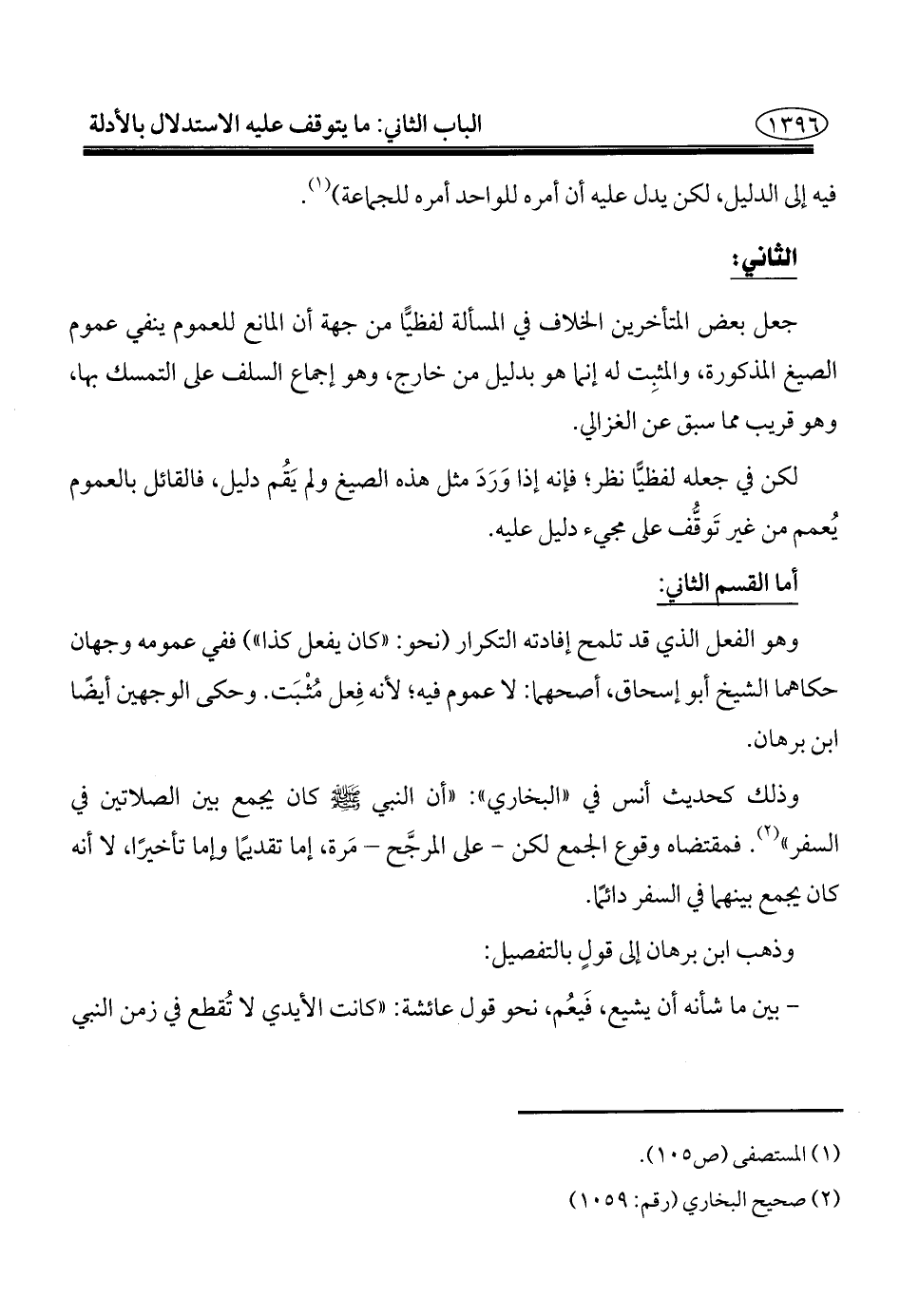 وذلك كحديث أنس في "البخاري": "أن النبي - صلى الله عليه وسلم - كان يجمع بين الصلاتين في السفر" (¬٢). فمقتضاه وقوع الجمع لكن -على المرجَّح- مَرة، إما تقديمًا وإما تأخيرًا، لا أنه كان يجمع بينهما في السفر دائمًا.