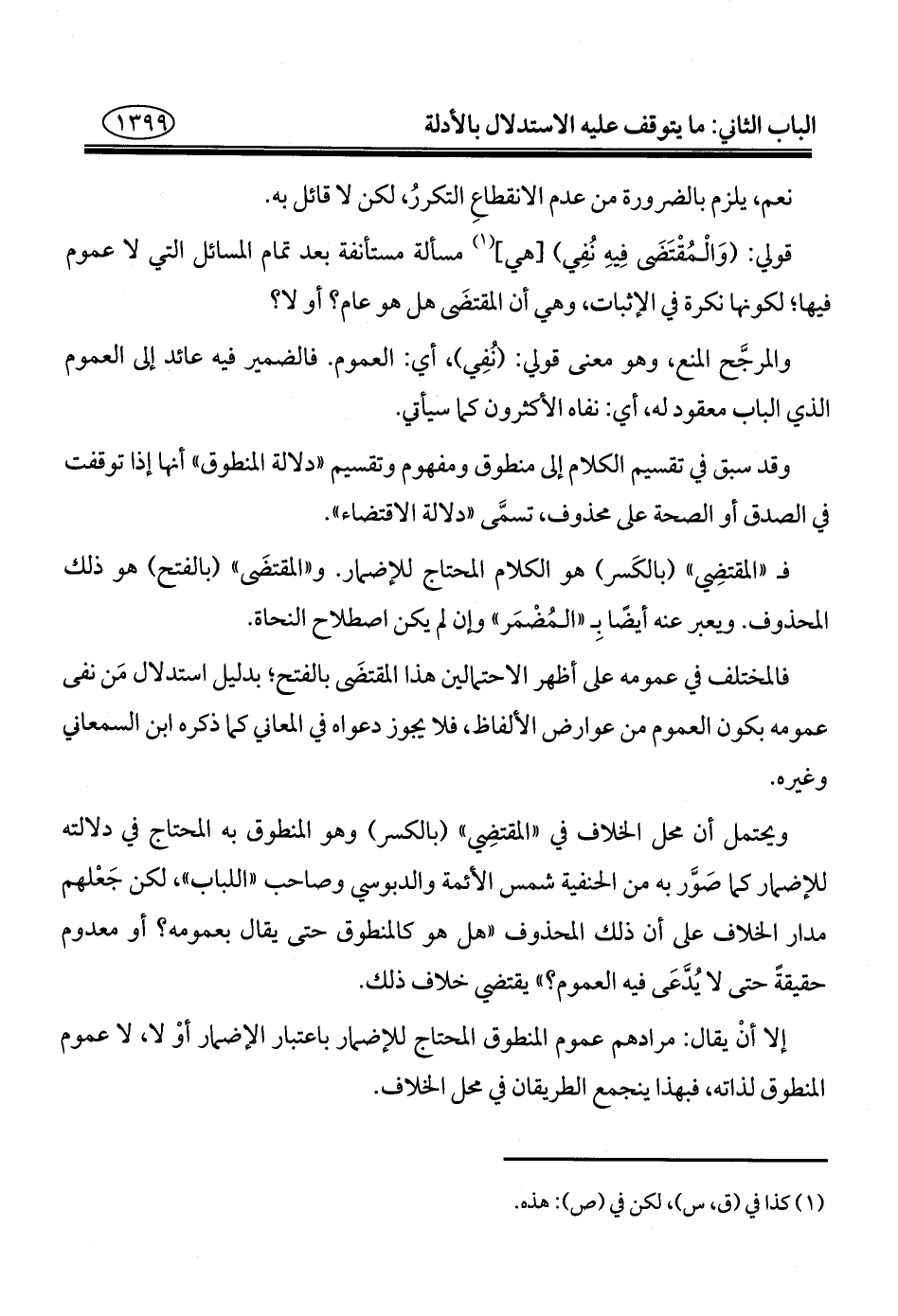 قولي: (وَالْمُقْتَضَى فِيهِ نُفِي) [هي] (¬١) مسألة مستأنفة بعد تمام المسائل التي لا عموم فيها؛ لكونها نكرة في الإثبات، وهي أن المقتضَى هل هو عام؟ أو لا؟