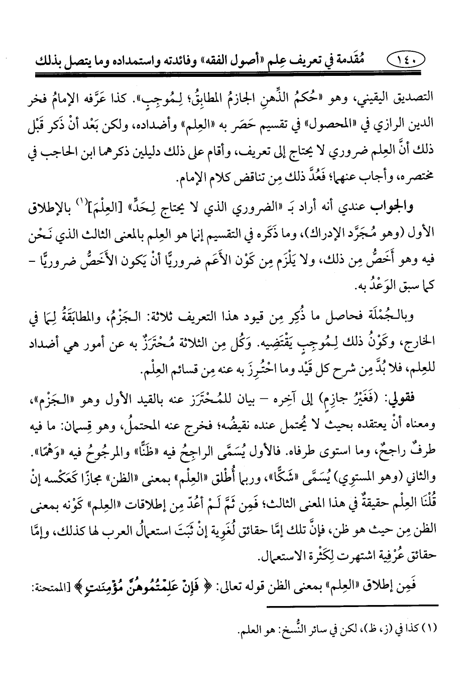 التصديق اليقيني، وهو "حُكمُ الذِّهنِ الجازمُ المطابِقُ؛ لِمُوجِبٍ". كذا عَرَّفه الإمامُ فخر الدين الرازي في "المحصول" في تقسيم حَصَر به "العِلم" وأضداده، ولكن بَعْد أنْ ذَكر قَبْل ذلك أنَّ العِلم ضروري لا يحتاج إلى تعريف، وأقام على ذلك دليلين ذكرهما ابن الحاجب في مختصره، وأجاب عنهما؛ فَعُدَّ ذلك مِن تناقض كلام الإمام.