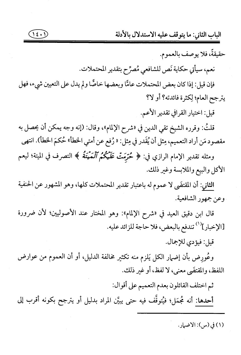 الثاني: أن المقتضَى لا عموم له باعتبار تقدير المحتملات كلها، وهو المشهور عن الحنفية وعن جمهور الشافعية.