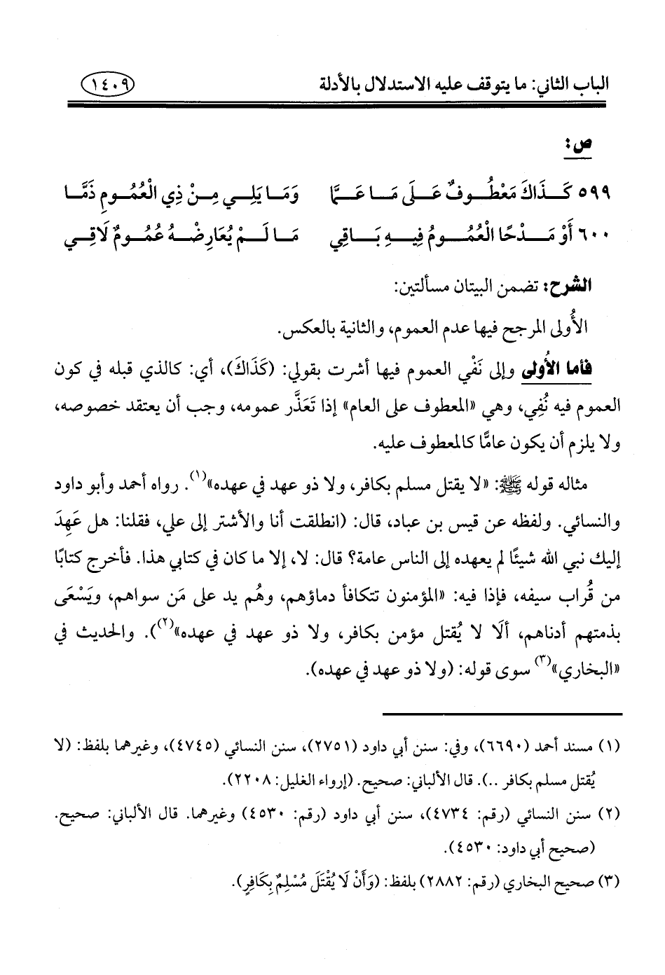 مثاله قوله - صلى الله عليه وسلم -: "لا يقتل مسلم بكافر، ولا ذو عهد في عهده" (¬١). رواه أحمد وأَبو داود والنَّسائي. ولفظه عن قيس بن عباد، قال: (انطلقت أنا والأشتر إلى علي، فقلنا: هل عَهِدَ إليك نبي الله شيئًا لم يعهده إلى الناس عامة؛ قال: لا، إلَّا ما كان في كتابي هذا. فأخرج كتابًا من قُراب سيفه، فإذا فيه: "المؤمنون تتكافأ دماؤهم، وهُم يد على مَن سواهم، وَيسْعَى بذمتهم أدناهم، ألَا لا يُقتل مؤمن بكافر، ولا ذو عهد في عهده") (¬٢). والحديث في "البخاري" (¬٣) سوى قوله: (ولا ذو عهد في عهده).