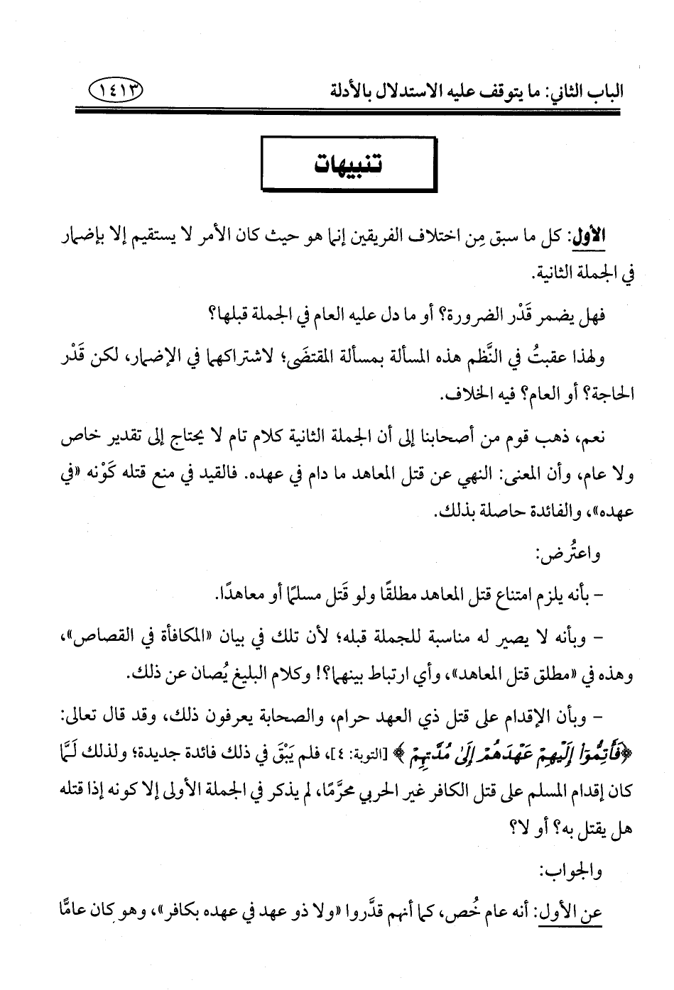 - وبأن الإقدام على قتل ذي العهد حرام، والصحابة يعرفون ذلك، وقد قال تعالى: {فَأَتِمُّوا إِلَيْهِمْ عَهْدَهُمْ إِلَى مُدَّتِهِمْ} [التوبة: ٤]، فلم يَبْقَ في ذلك فائدة جديدة؛ ولذلك لَمَّا كان إقدام المسلم على قتل الكافر غير الحربي محرَّمًا، لم يذكر في الجملة الأولى إلَّا كونه إذا قتله هل يقتل به؟ أو لا؟