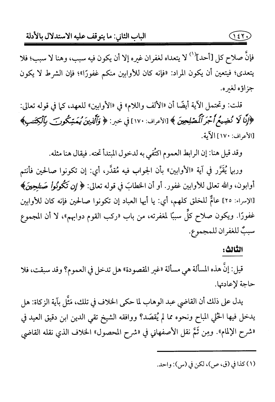 فإنَّ صلاح كل [أحد] (¬١) لا يتعداه لغفران غيره إلَّا أن يكون فيه سبب، وهنا لا سبب؛ فلا يتعدى، فيتعين أن يكون المراد: "فإنه كان للأوابين منكم غفورًا"، فإن الشرط لا يكون جزاؤه لغيره.