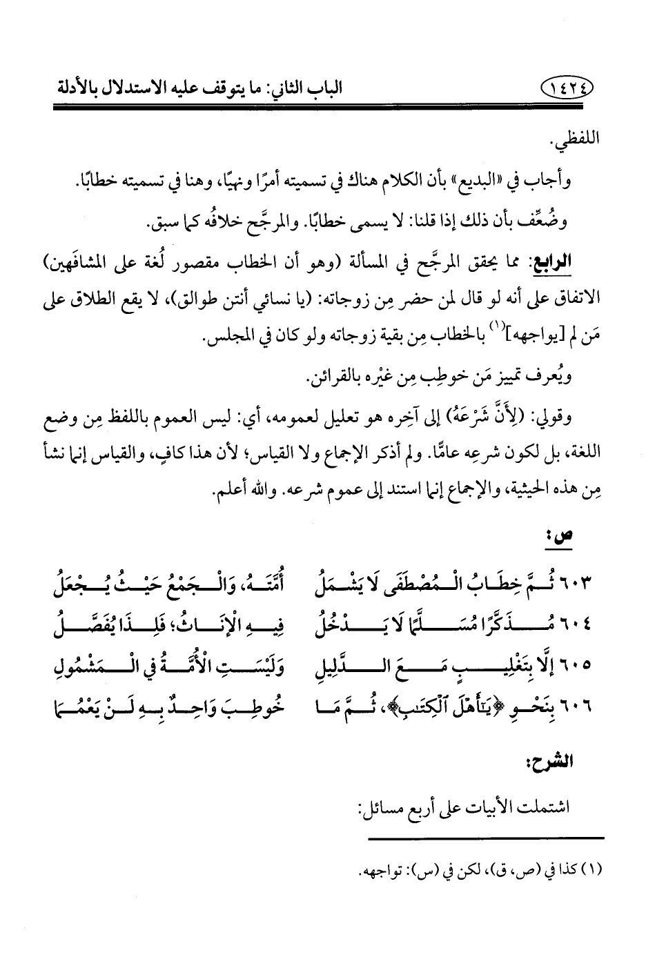 ٦٠٣ - ثُمَّ خِطَابُ الْمُصْطَفَى لَا يَشْمَلُ ... أُمَّتَهُ، وَالْجَمْعُ حَيْثُ يُجْعَلُ