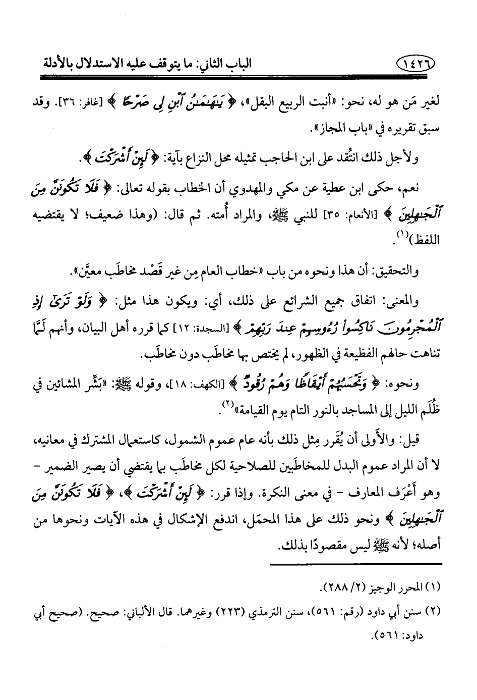 قيل: والأَولى أن يُقَرر مِثل ذلك بأنه عام عموم الشمول، كاستعمال المشترك في معانيه، لا أن المراد عموم البدل للمخاطَبين للصلاحية لكل مخاطَب بما يقتضي أن يصير الضمير - وهو أَعْرَف المعارف - في معنى النكرة. وإذا قرر: {لَئِنْ أَشْرَكْتَ}، {فَلَا تَكُونَنَّ مِنَ الْجَاهِلِينَ} ونحو ذلك على هذا المحمَل، اندفع الإشكال في هذه الآيات ونحوها من أصله؛ لأنه - صلى الله عليه وسلم - ليس مقصودًا بذلك.