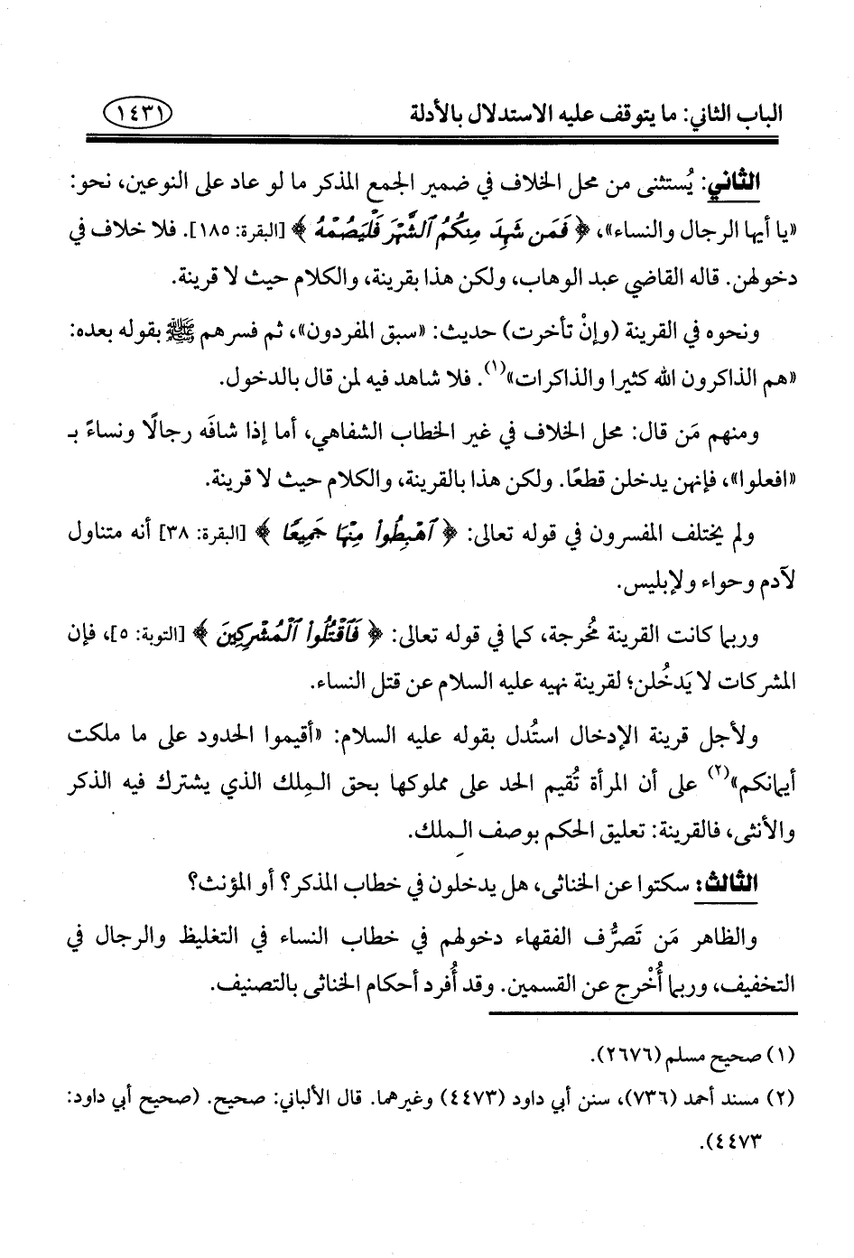 الثاني: يُستثنى من محل الخلاف في ضمير الجمع المذكر ما لو عاد على النوعين، نحو: "يا أيها الرجال والنساء"، {فَمَنْ شَهِدَ مِنْكُمُ الشَّهْرَ فَلْيَصُمْهُ} [البقرة: ١٨٥]. فلا خلاف في دخولهن. قاله القاضي عبد الوهاب، ولكن هذا بقرينة، والكلام حيث لا قرينة.