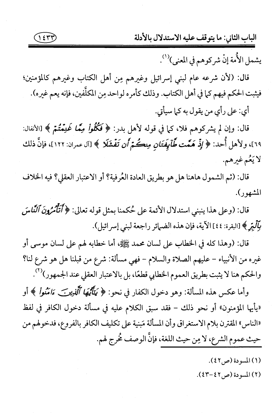 قال: (وعلى هذا ينبني استدلال الأئمة على حُكمنا بمثل قوله تعالى: {أَتَأْمُرُونَ النَّاسَ بِالْبِرِّ} [البقرة: ٤٤]، الآية، فإن هذه الضمائر راجعة لبني إسرائيل).