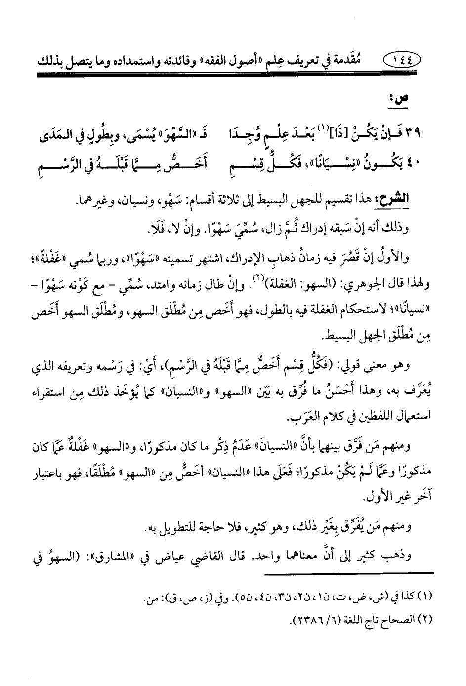٣٩ - فَإنْ يَكُنْ [ذَا] (¬١) بَعدَ عِلْمٍ وُجِدَا ... فَـ "السَّهْوَ" يُسْمَى، وبِطُولٍ في المَدَى