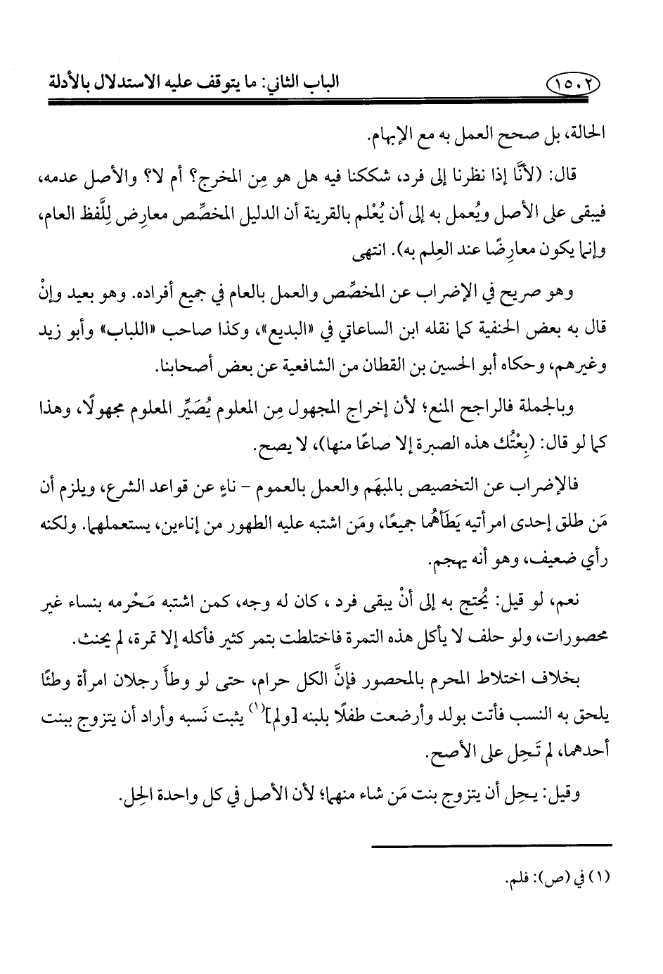 فالإضراب عن التخصيص بالمبهَم والعمل بالعموم -ناءٍ عن قواعد الشرع، ويلزم أن مَن طلق إحدى امرأتيه يَطَأهُما جميعًا، ومَن اشتبه عليه الطهور من إناءين، يستعملهما. ولكنه رأي ضعيف، وهو أنه يهجم.