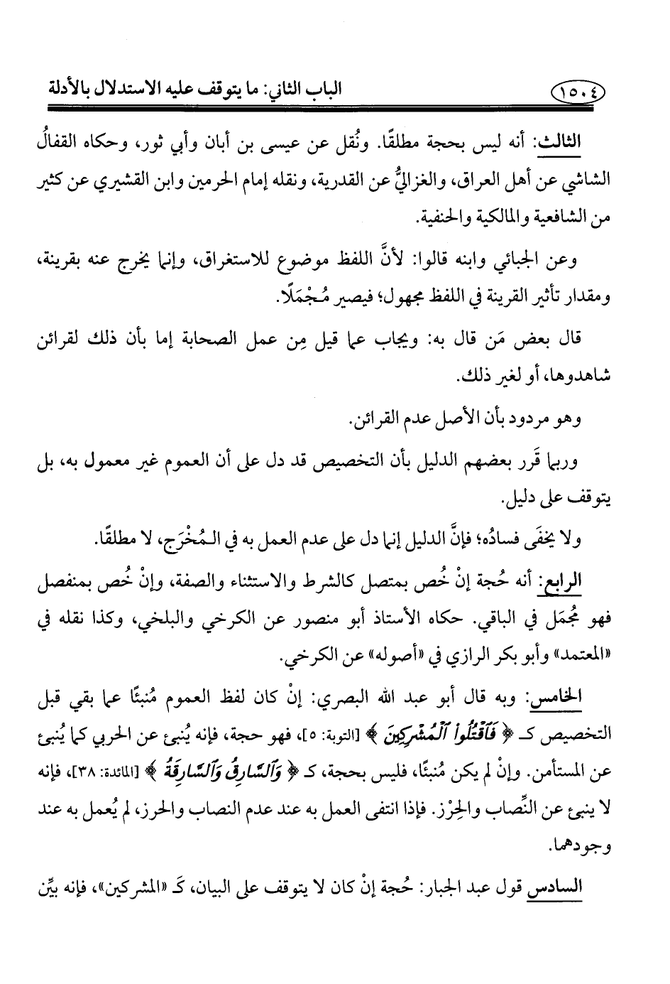 السادس قول عبد الجبار: حُجة إنْ كان لا يتوقف على البيان، كَـ "المشركين"، فإنه بيِّن