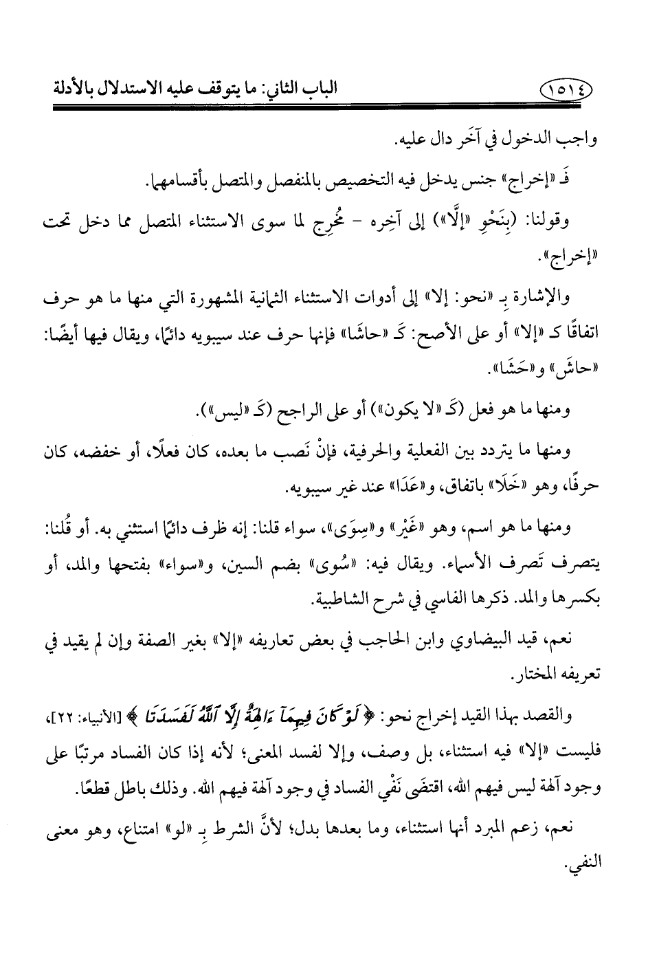 والقصد بهذا القيد إخراج نحو: {لَوْ كَانَ فِيهِمَا آلِهَةٌ إِلَّا اللَّهُ لَفَسَدَتَا} [الأنبياء: ٢٢]، فليست "إلا" فيه استثناء، بل وصف، وإلا لفسد المعنى؛ لأنه إذا كان الفساد مرتبًا على وجود آلهة ليس فيهم الله، اقتضَى نَفْي الفساد في وجود آلهة فيهم الله. وذلك باطل قطعًا.