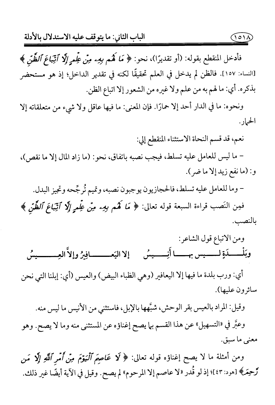 فأدخل المنقطع بقوله: (أو تقديرًا)، نحو: {مَا لَهُمْ بِهِ مِنْ عِلْمٍ إِلَّا اتِّبَاعَ الظَّنِّ} [النساء: ١٥٧]. فالظن لم يدخل في العلم تحقيقًا لكنه في تقدير الداخل، إذ هو مستحضر بذكره. أي: ما لهم به من علم ولا غيره من الشعور إلا اتباع الظن.