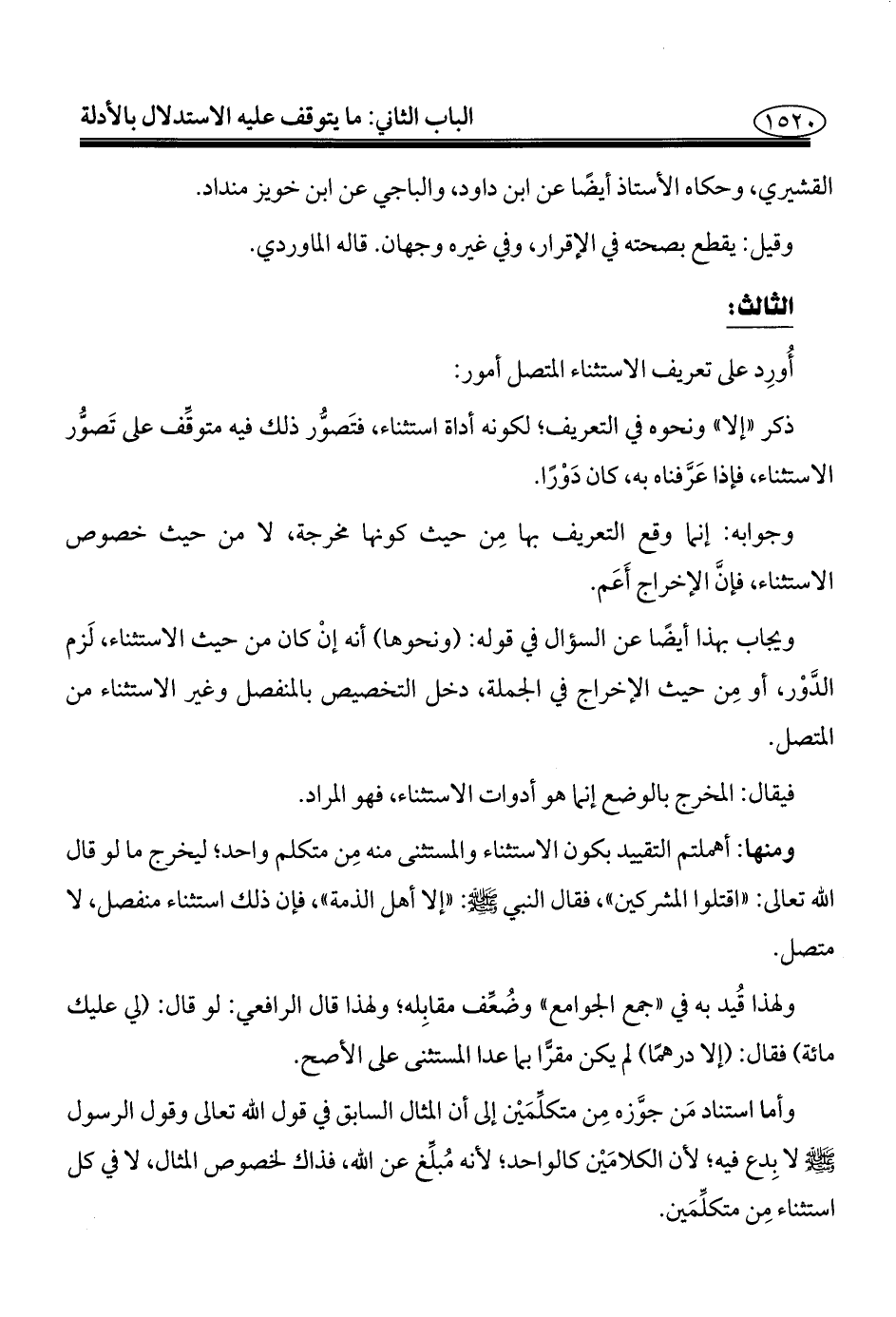 ومنها: أهملتم التقييد بكون الاستثناء والمستثنى منه مِن متكلم واحد؛ ليخرج ما لو قال الله تعالى: "اقتلوا المشركين"، فقال النبي - صلى الله عليه وسلم -: "إلا أهل الذمة"، فإن ذلك استثناء منفصل، لا متصل.