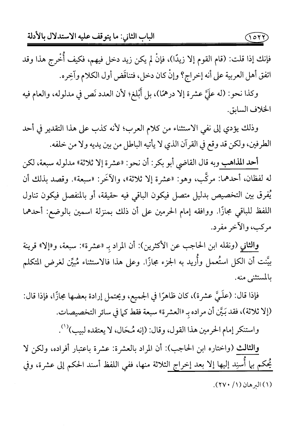 فإذا قال: (علَيَّ عشرة)، كان ظاهرًا في الجميع، ويحتمل إرادة بعضها مجازًا، فإذا قال: (إلا ثلاثة)، فقد بَيَّن أن مراده بِـ "العشرة" سبعة فقط كما في سائر التخصيصات.
