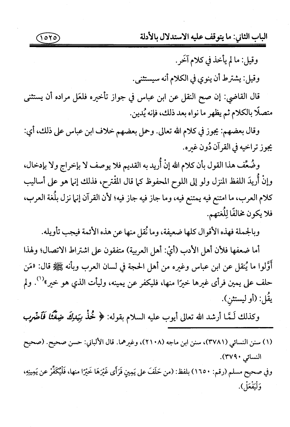 أما ضعفها فلأن أهل الأدب (أيْ: أهل العربية) متفقون على اشتراط الاتصال؛ ولهذا أَوَّلوا ما يُنقل عن ابن عباس وغيره من أهل الحجة في لسان العرب وبأنه - صلى الله عليه وسلم - قال: "مَن حلف على يمين فرأى غيرها خيرًا منها، فليكفر عن يمينه، وليأت الذي هو خير" (¬١). ولم يقُل: (أو ليستثنِ).