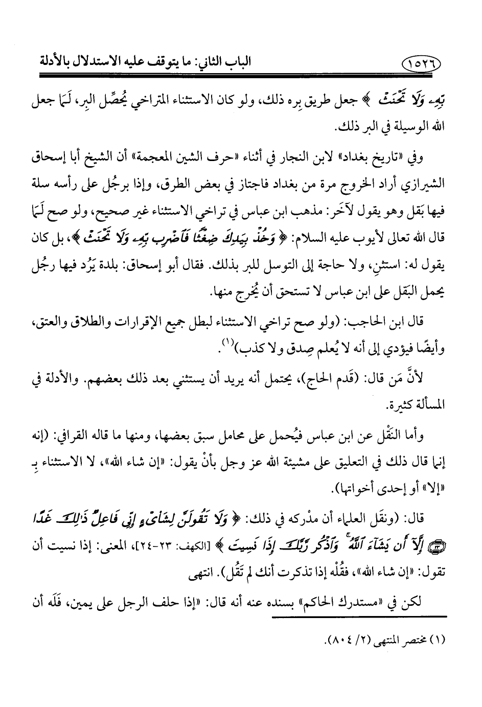 بِهِ وَلَا تَحْنَثْ} جعل طريق بِره ذلك، ولو كان الاستثناء المتراخي يُحصِّل البِر، لَمَا جعل الله الوسيلة في البر ذلك.