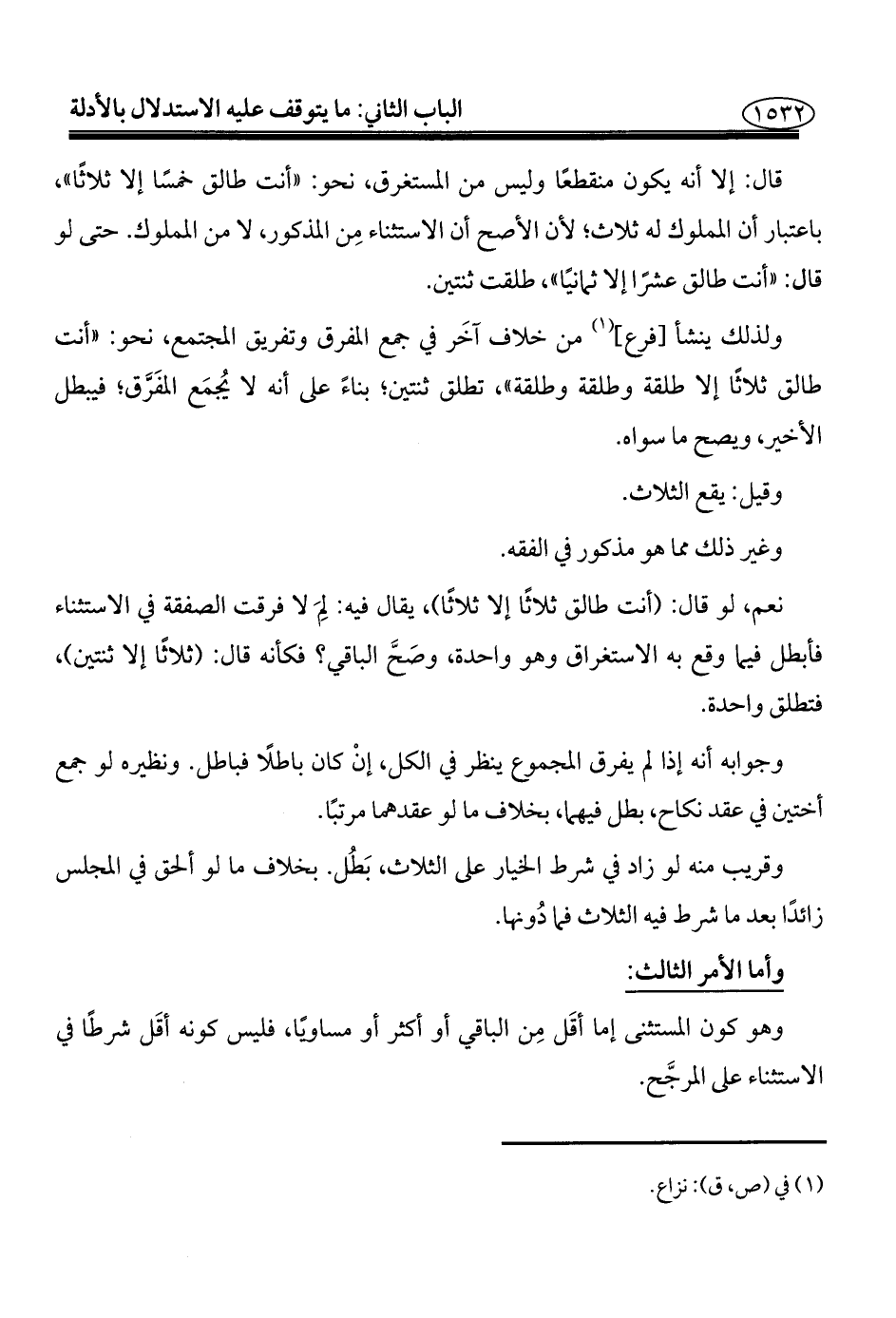 وهو كون المستثنى إما أقَل مِن الباقي أو أكثر أو مساويًا، فليس كونه أقَل شرطًا في الاستثناء على المرجَّح.