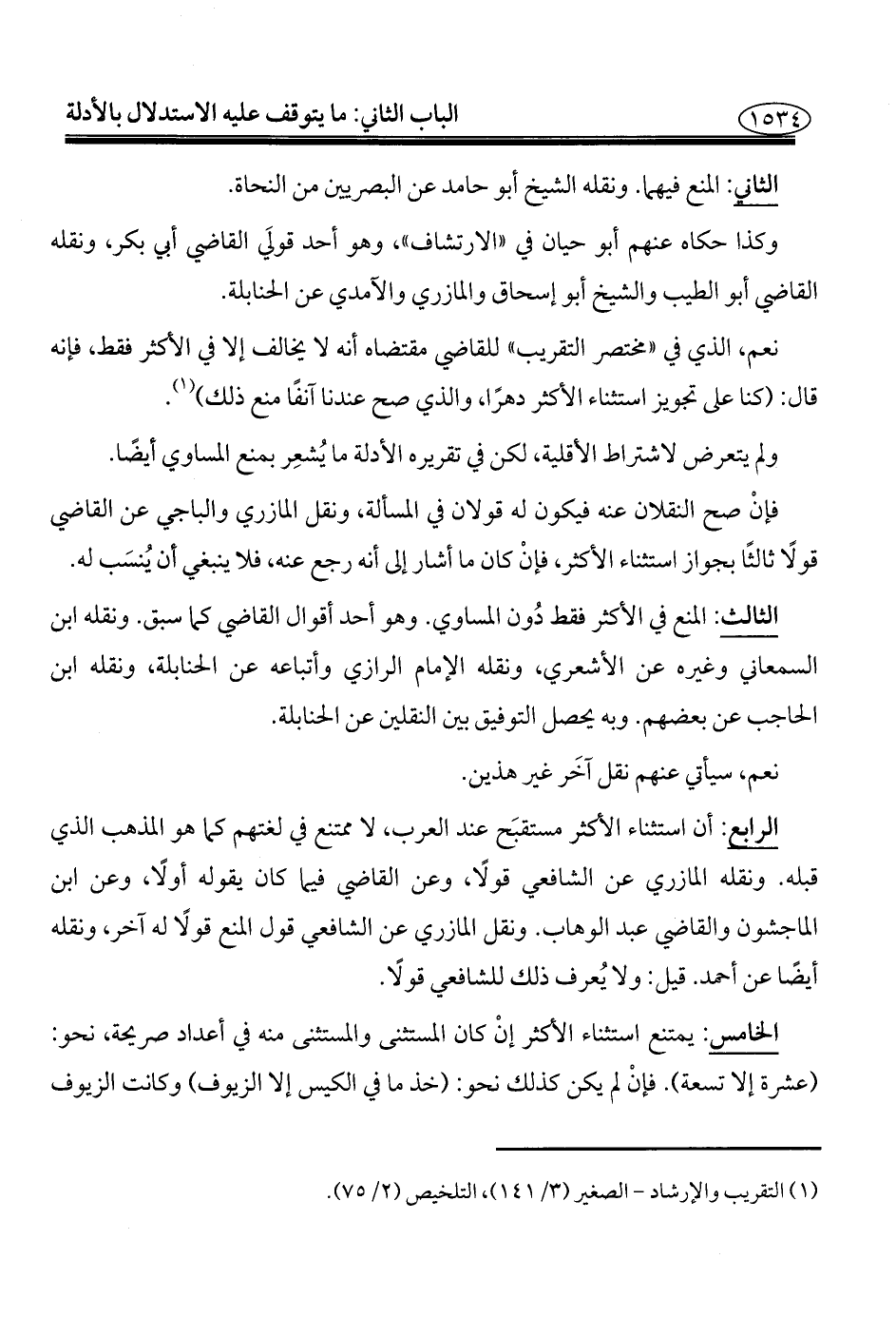 الرابع: أن استثناء الأكثر مستقبَح عند العرب، لا ممتنع في لغتهم كما هو المذهب الذي قبله. ونقله المازري عن الشافعي قولًا، وعن القاضي فيما كان يقوله أولًا، وعن ابن الماجشون والقاضي عبد الوهاب. ونقل المازري عن الشافعي قول المنع قولًا له آخر، ونقله أيضًا عن أحمد. قيل: ولا يُعرف ذلك للشافعي قولًا.