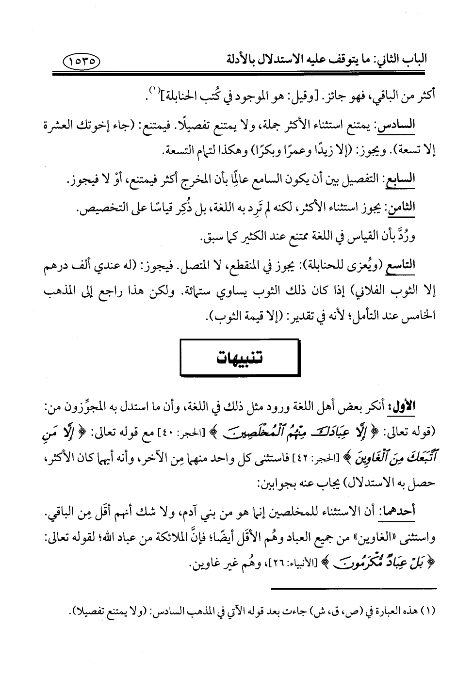 السادس: يمتنع استثناء الأكثر جملة، ولا يمتنع تفصيلًا. فيمتنع: (جاء إخوتك العشرة إلا تسعة). ويجوز: (إلا زيدًا وعمرًا وبكرًا) وهكذا لتمام التسعة.