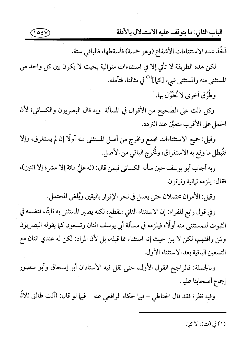 وفي قول رابع للفراء: إن الاستثناء الثاني منقطع، لكنه يصير المستثنى به ثابتًا، فتضمه في الثبوت للمستثنى منه أولًا، فيلزمه في مسألة أبي يوسف اثنان وتسعون كما يقوله البصريون ومَن وافقهم، لكن لا مِن حيث إنه استثناء مما قبله، بل لأن المراد: لكن له عندي اثنان مع التسعين الباقية بعد الاستثناء الأول.