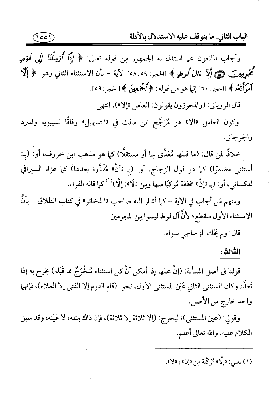 وأجاب المانعون عما استدل به الجمهور مِن قوله تعالى: {إِنَّا أُرْسِلْنَا إِلَى قَوْمٍ مُجْرِمِينَ (٥٨) إِلَّا آلَ لُوطٍ} [الحجر: ٥٨، ٥٩] الآية - بأن الاستثناء الثاني وهو: {إِلَّا امْرَأَتَهُ} [الحجر: ٦٠] إنما هو من قوله: {أَجْمَعِينَ} [الحجر: ٥٩].