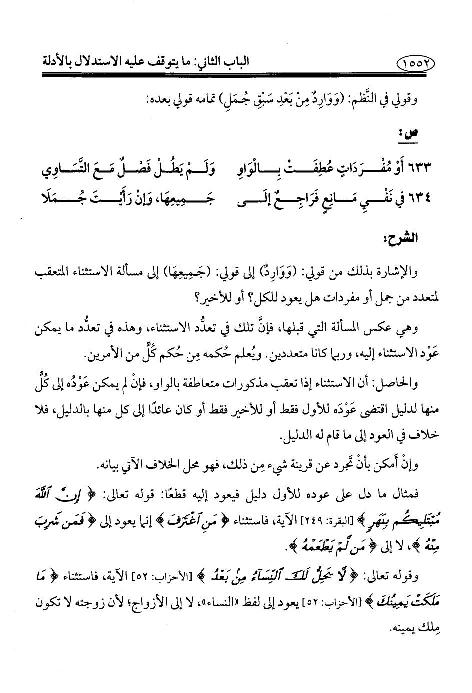 والإشارة بذلك من قولي: (وَوَارِدٌ) إلى قولي: (جَمِيعِهَا) إلى مسألة الاستثناء المتعقب لمتعدد من جمل أو مفردات هل يعود للكل؟ أو للأخير؟