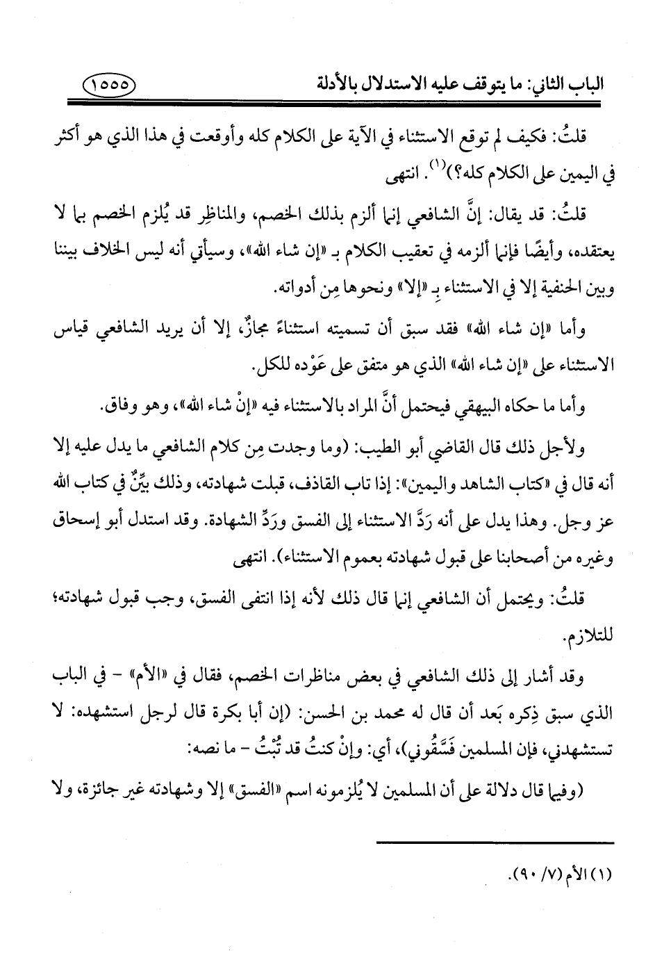 قلتُ: قد يقال: إنَّ الشافعي إنما ألزم بذلك الخصم، والمناظِر قد يُلزم الخصم بما لا يعتقده، وأيضًا فإنما ألزمه في تعقيب الكلام بـ "إن شاء الله"، وسيأتي أنه ليس الخلاف بيننا وبين الحنفية إلا في الاستثناء بِـ "إلا" ونحوها مِن أدواته.